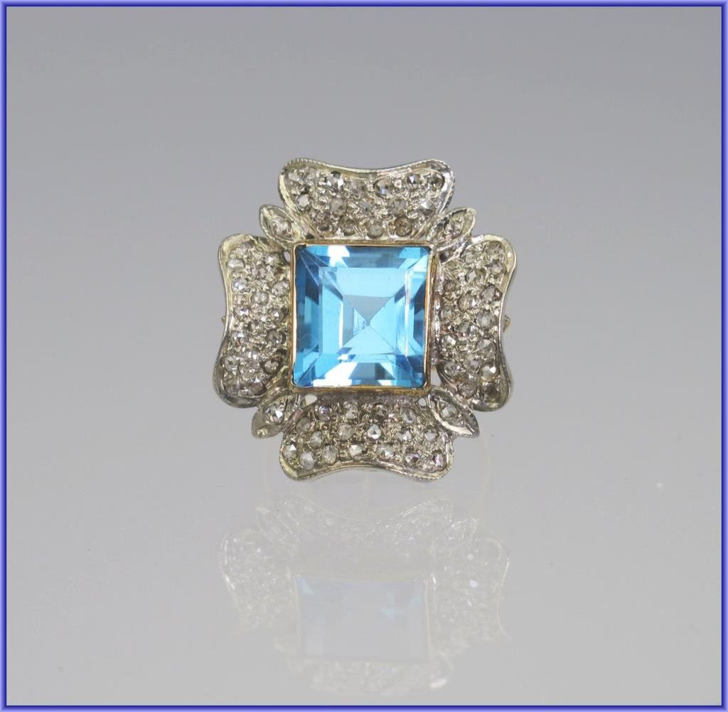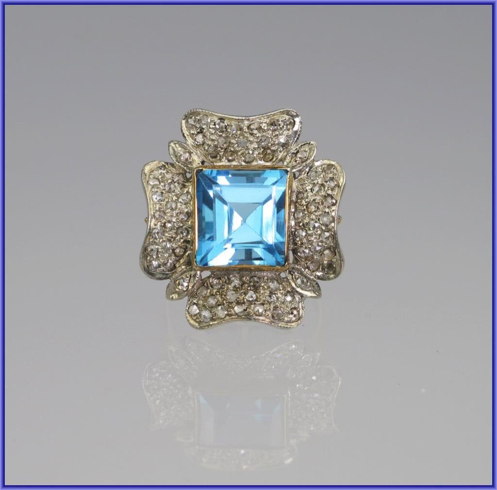 Antique Victorian Blue Topaz and Diamond Flower Ring featuring a 7.25 carat square Swiss blue topaz with Fine color and VS clarity and 74 old Rose cut Diamonds weighing 2.00 carats with H-J colors set in antique setting of combination 14 karat yellow gold and Sterling Silver – Victorian Period Practice. Please See FULL Appraisal. Retail $3,000-$4,000 Estimate $1,200-$1,600
