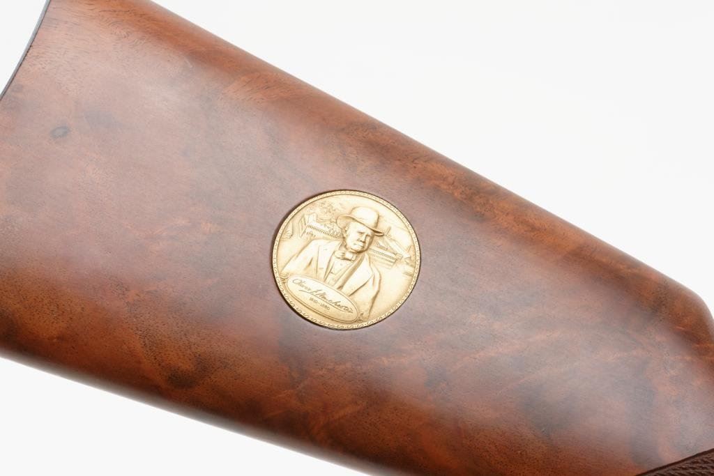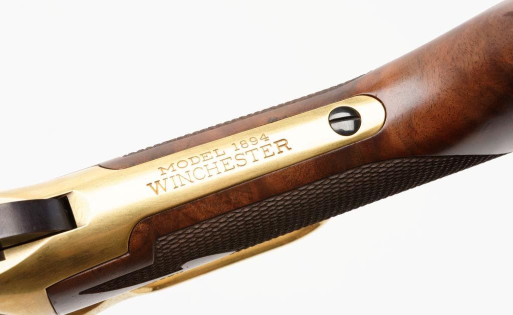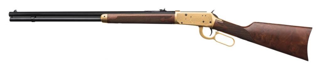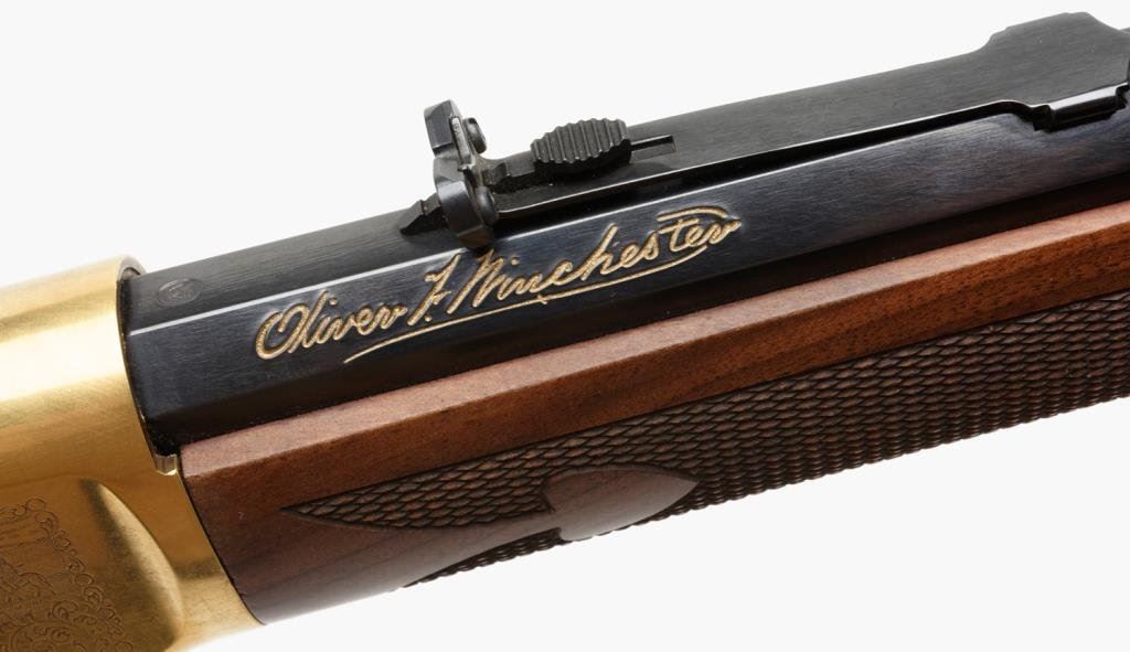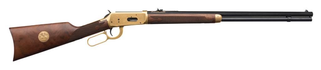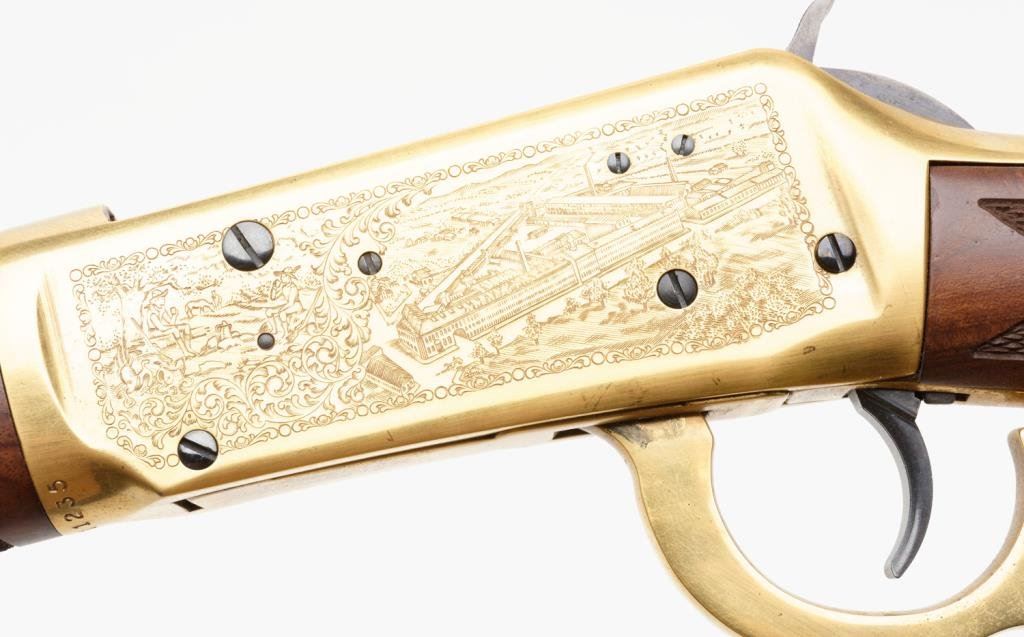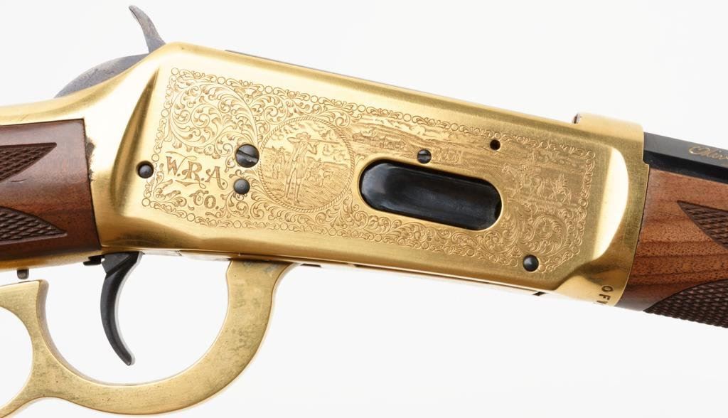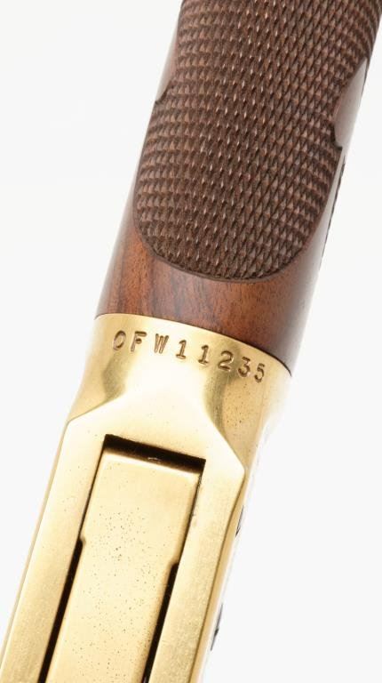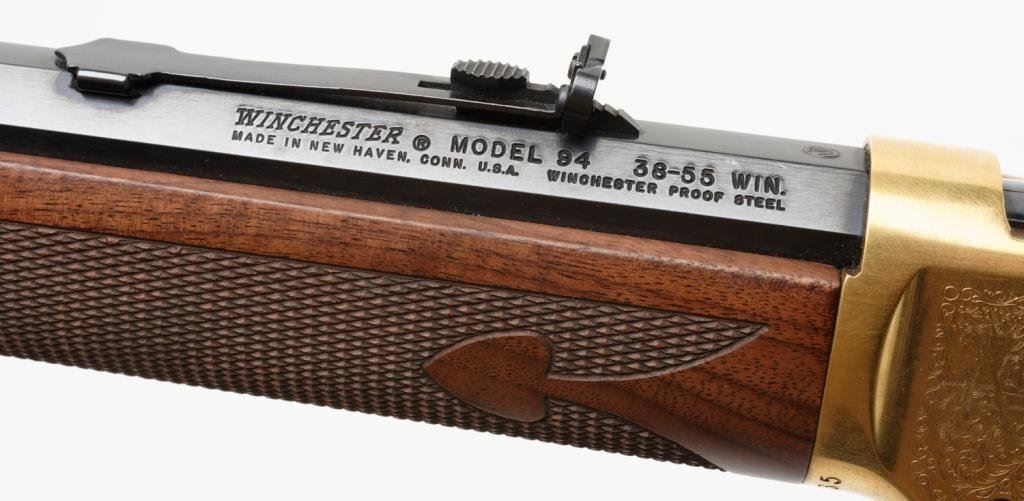 Winchester Model 1894 Oliver Winchester Commemorative, .38-55 cal., 24" octagon barrel, full magazine, rifle butt, blue and gold finish, impressed checkered wood stocks with commemorative scenes and plaques, serial #OFW11235. The rifle remains in fine to excellent condition, no evidence of firing or use, 98-99%, some handling and storage wear. No box, no tags. Est.: $500-$1,000