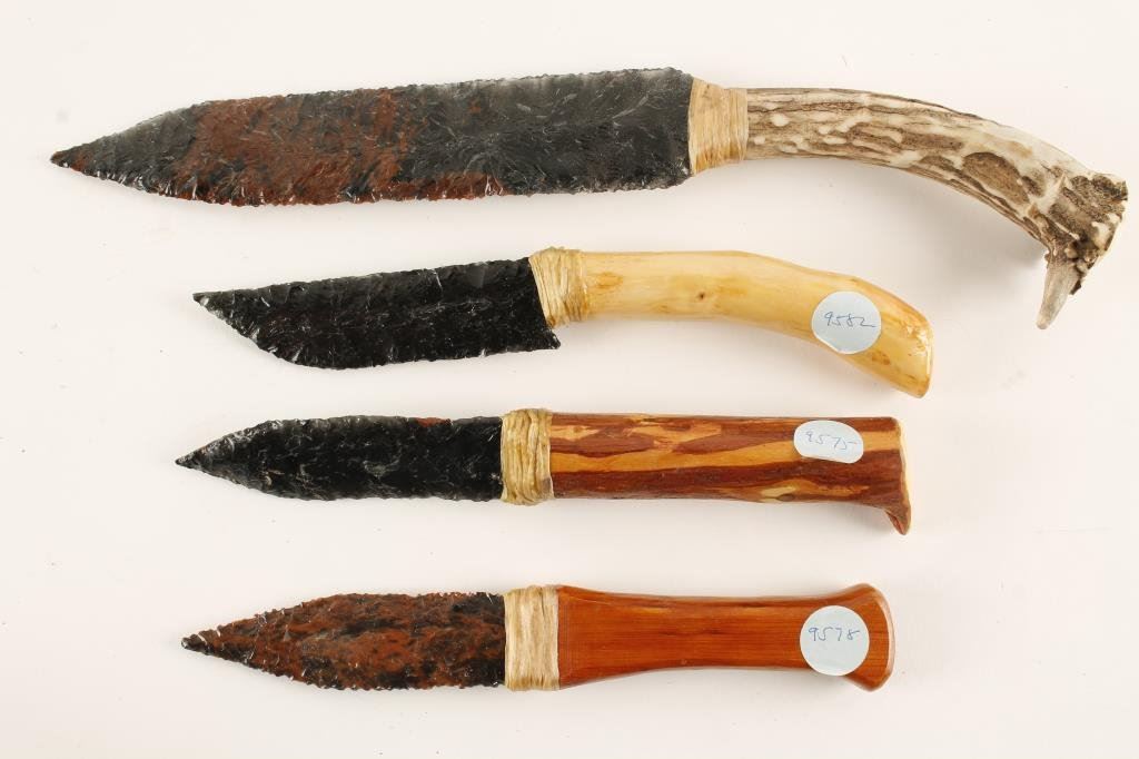 Lot of four (4) "chipped flint knives" with nicely made wood and horn grips and rawhide wrap. A labor of love that would be prohibitable to have customer made. Various lengths and sizes. Est.: $250-$1,000