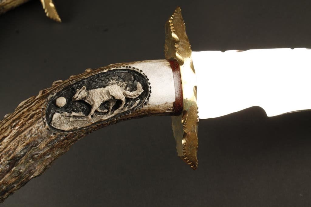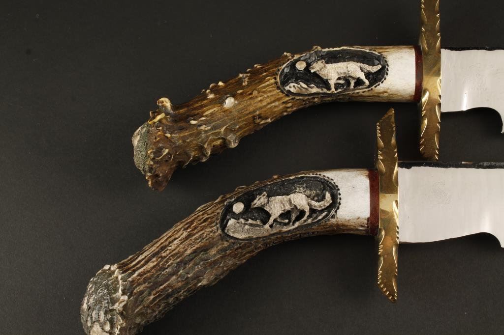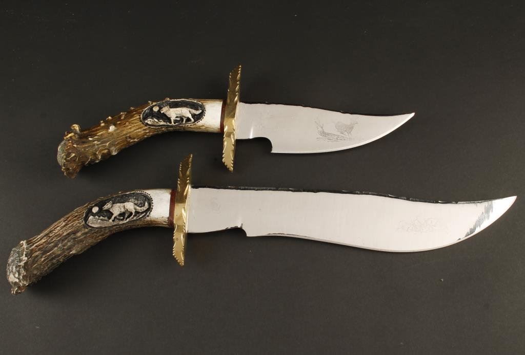 Two custom stag handled knives, one is approx. 17” overall with an 11” blade, the other is approx. 12” overall with a 6” blade, both in like new condition with brass cross guard, animal scene carved into the right side of each stag grip and both contained in an oak and glass display kit; maker’s mark is B.C.S. with a curled-up rattlesnake at the base of each blade and etched game scene on the right front side of each blade. Est.: $350-$700.