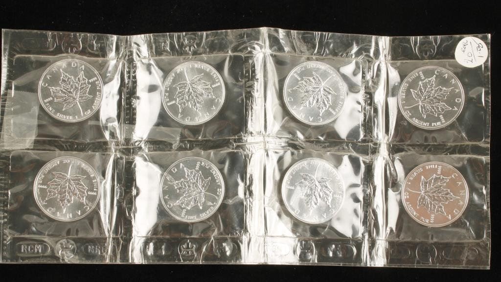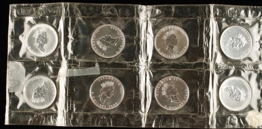 8 1999 Canadian 5 dollar pure silver coin uncirculated and sealed each weighing 1 troy ounce. Est:$200-400