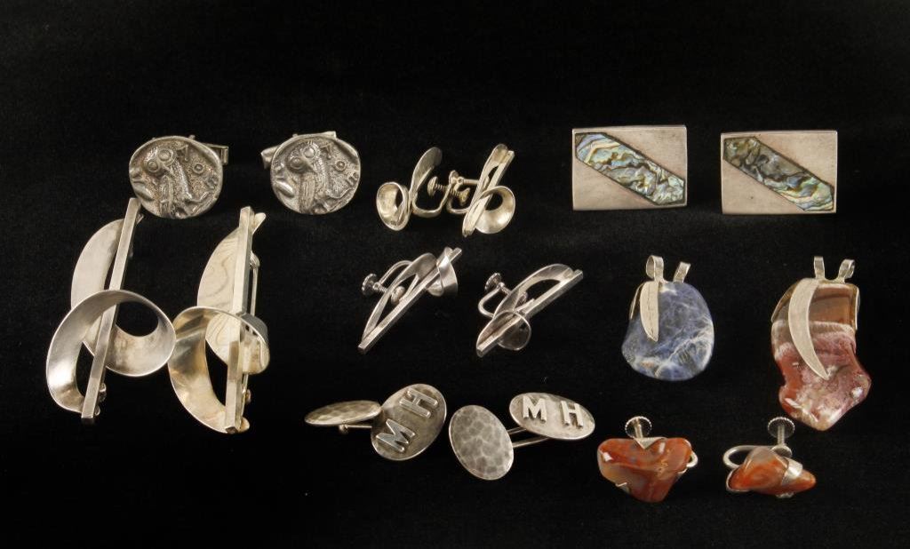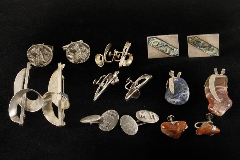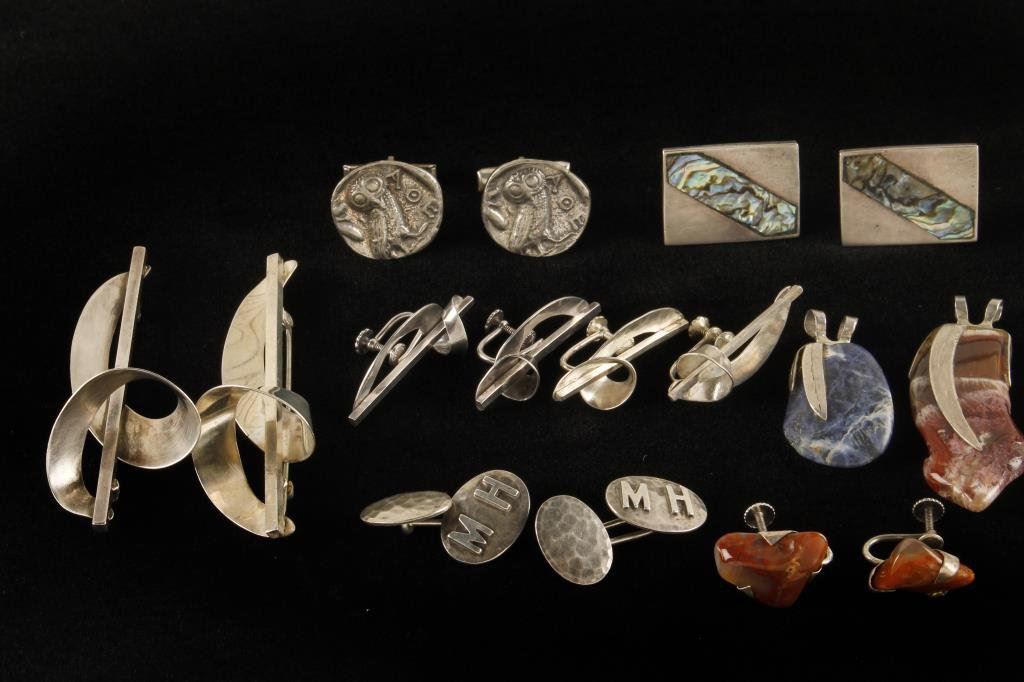 A unique collection of artistic silver jewelry containing agate 2 pendants and earrings, 2 modern brooches and matching earrings and 3 pairs of cufflinks . weight 105gm. Est:$175-200