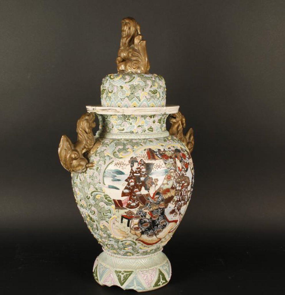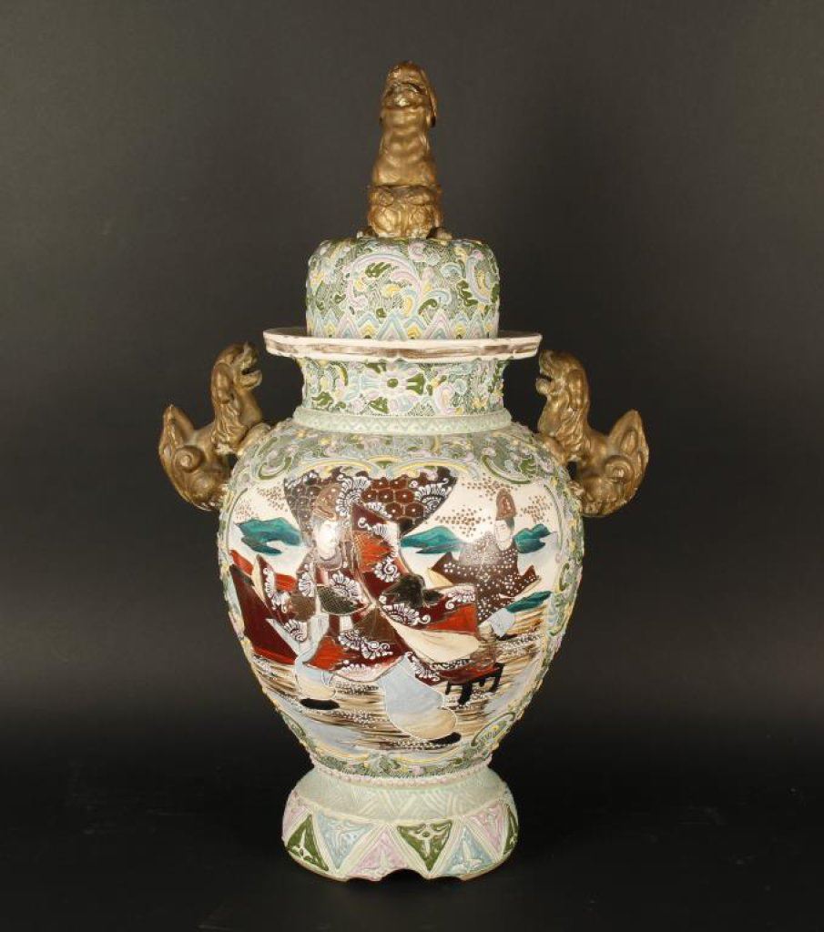 Chinese porcelain vase with relief work and hand painting; no marks; adorned with Foo Lions; has some age and nice quality. Est.: $500-$1,000.