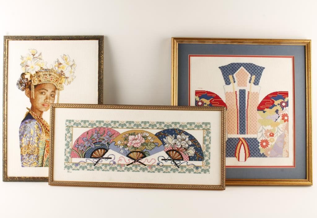 Three decorative embroideries from Asia on wood hanger, approximately 56” x 76”. Est.: $200-$400.