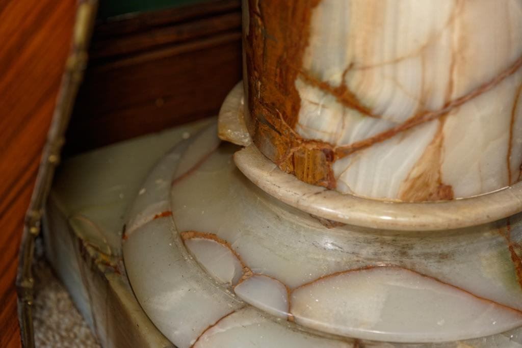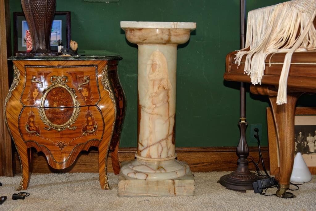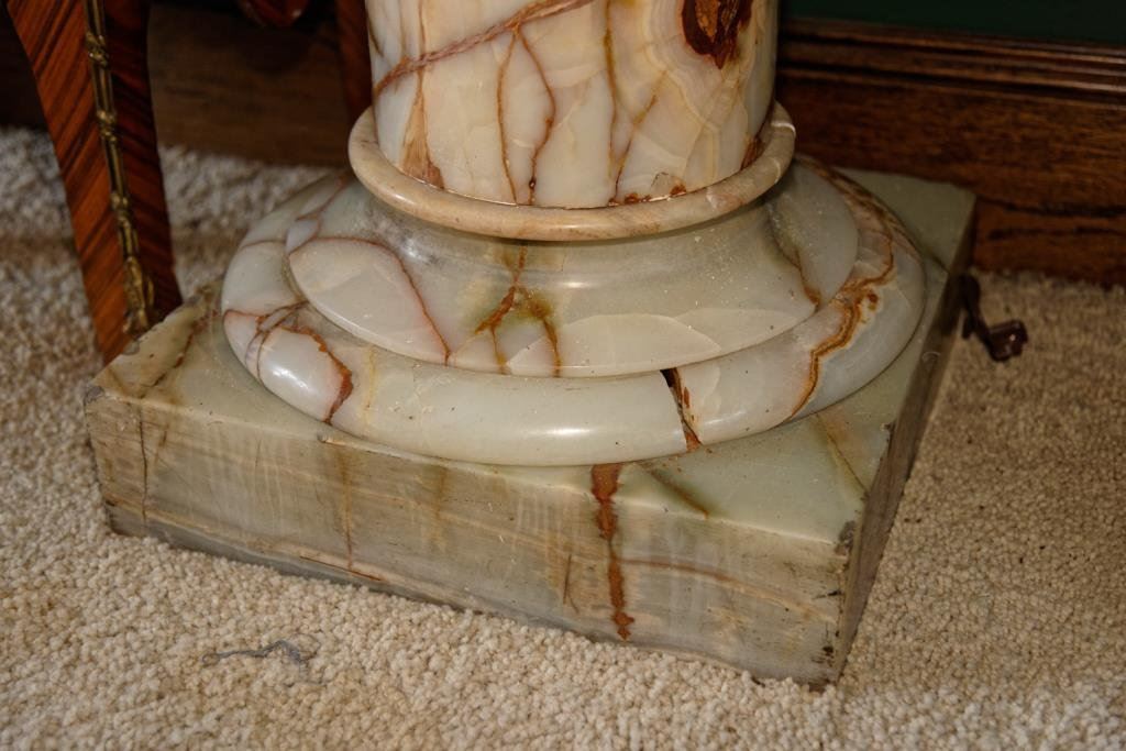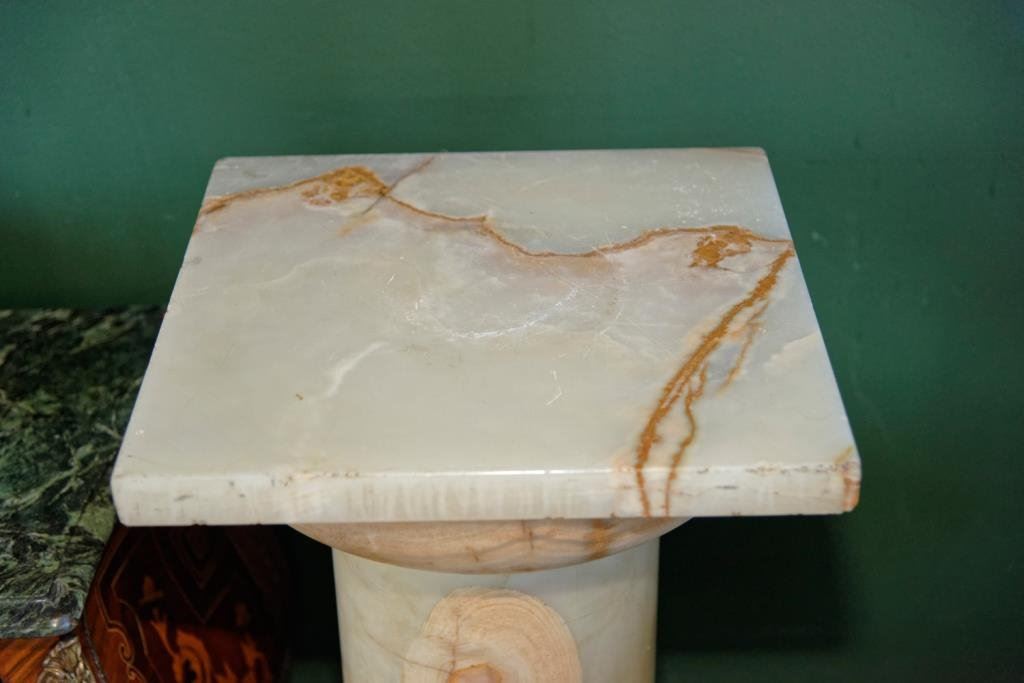 Rose and white marble pedestal. Measures 36" in Ht. The top measures 15" x 15". Break and crack to the base. Est.: $300-$600