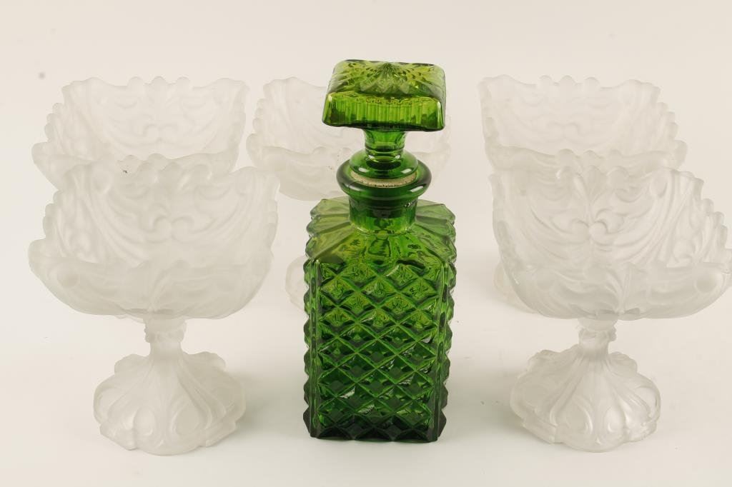 Five pressed and frosted glass candy compotes with green pressed glass decanter. Est.: $100-$150.