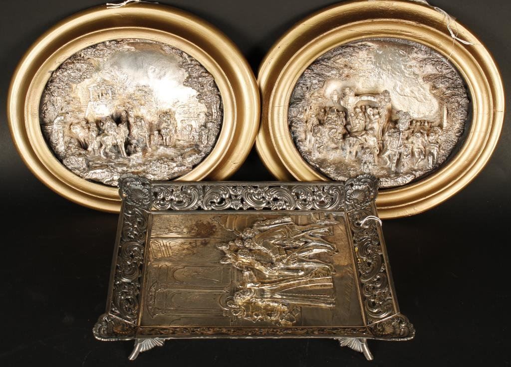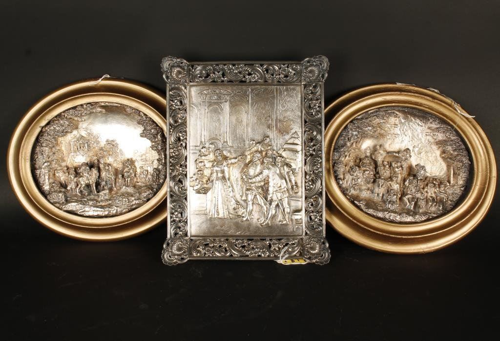 Silver plate scene of Queen at Court along with two high relief cast silver wall plaques in frames; one signed “Henry-93”. Est.: 250-$500.