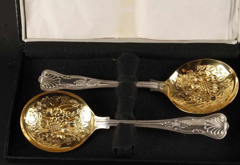 Lot 2328 Sheffield, England-marked serving spoons in box. Est.: $40-$80.