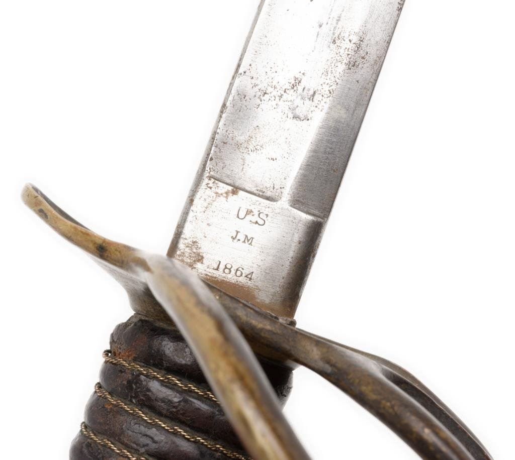 U.S. Model 1860 Cavalry sword and metal scabbard by Mansfield and Lamb in overall un-cleaned good condition with 1864-dated blade, some scattered spots of erosion on blade, wire wrapped leather grip, brass guard and pommel; heavy dark patina on scabbard. Est.: $300-$600.