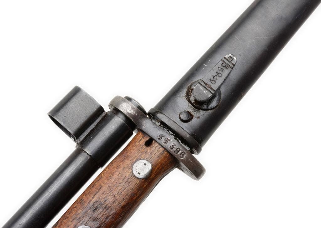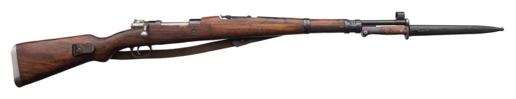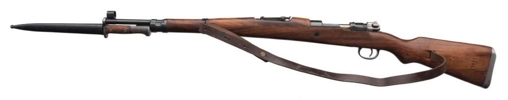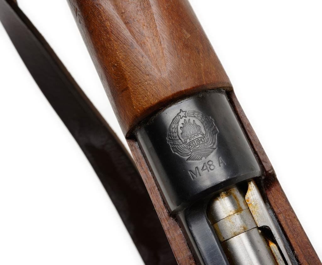 Yugoslavian Mauser Model 48A bolt action rifle, 8mm cal., 23-1/2” barrel, blue finish, wood stock, leather sling, import-marked, #31411 in overall good to very good condition showing the majority of its re-blued finish, packed with cosmoline, good bore, very good wood. Est.: $150-$300.
