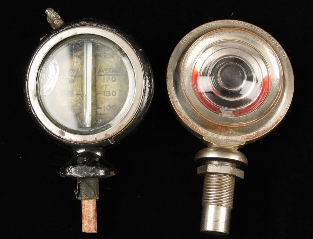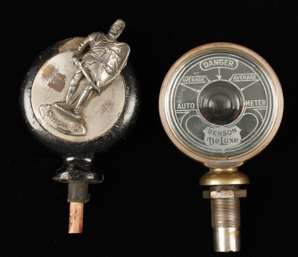 Lot of 2 auto collectibles; a Stearns Knight Motor Meter in fair to poor condition, needs some T.L.C. and repair; also a Benson Deluxe Auto-Meter in very good + condition, ca 1920’s. Est.: $175-$350.