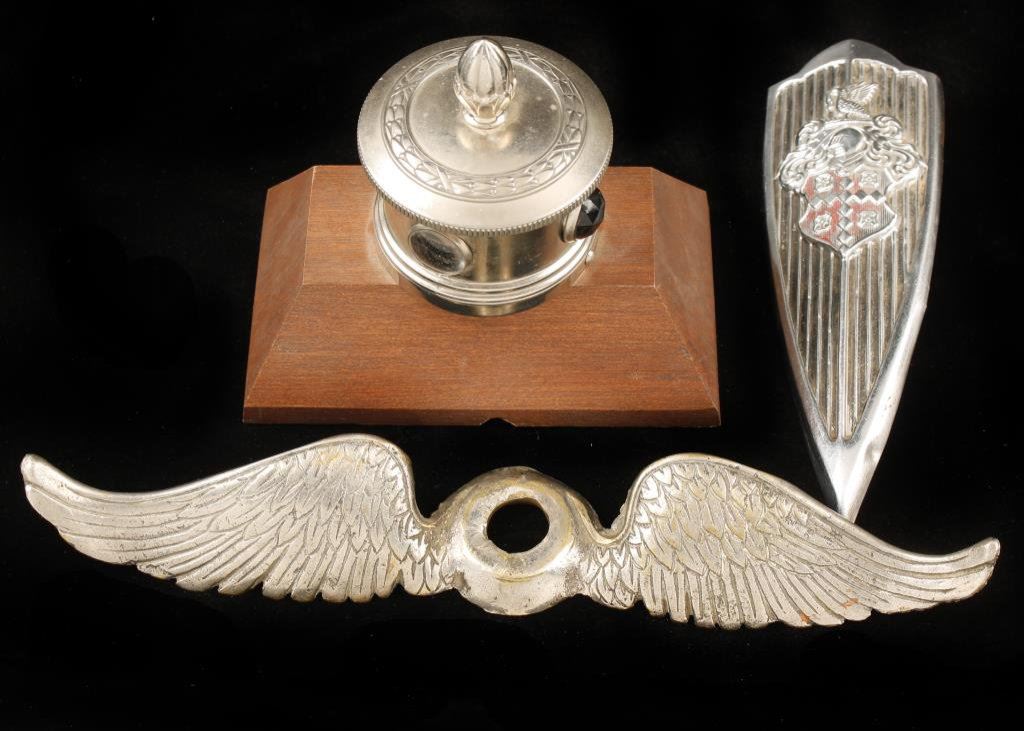 Lot of 3 automobile collectibles including a warning or brake light mounted on a wood base, ca 1920’s or earlier in excellent condition; a Packard grill badge, ca 1930’s to 40’s in very good condition with fading paint; also add-on wings for a hood mascot or ornament, brass plated, 1920’s or earlier. Est.: $250-$500.