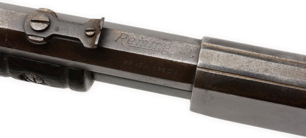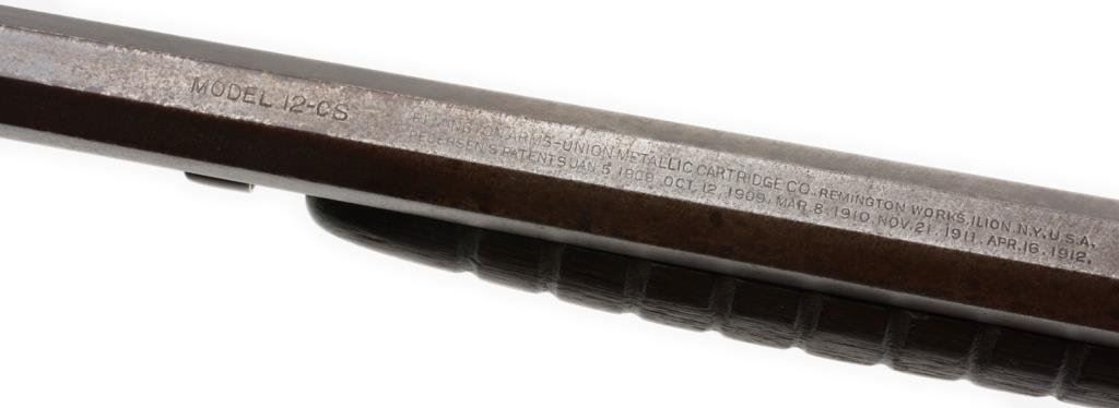 **Remington Model 12CS pump action rifle, .22 Rem. Special caliber, 24” octagon barrel, S/N 622382, overall fair condition with working action, fair bore and worn wood with old electrical tape repair to wrist of butt stock. Est.: $100-$200.
