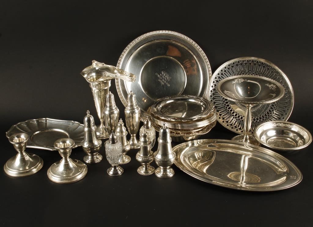 Thirty-four pieces of marked antique and vintage sterling including fine bud vase with handle; hand engraved. Est.: $300-$600.