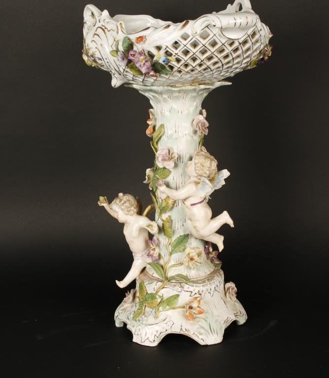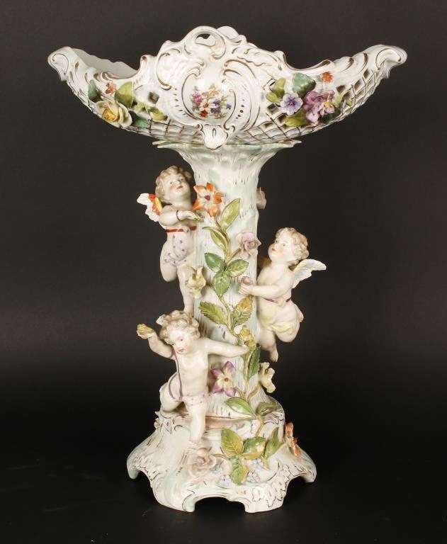 German 19th Century compote with cherubs; crossed swords and âTâ marked; approximately 16â in height and 12â across bowl. Est.: $350-$700.
