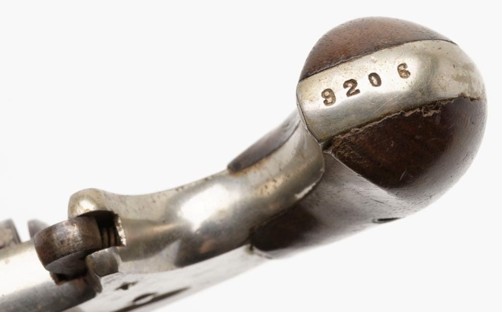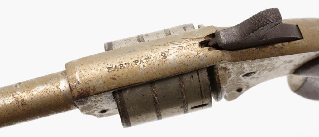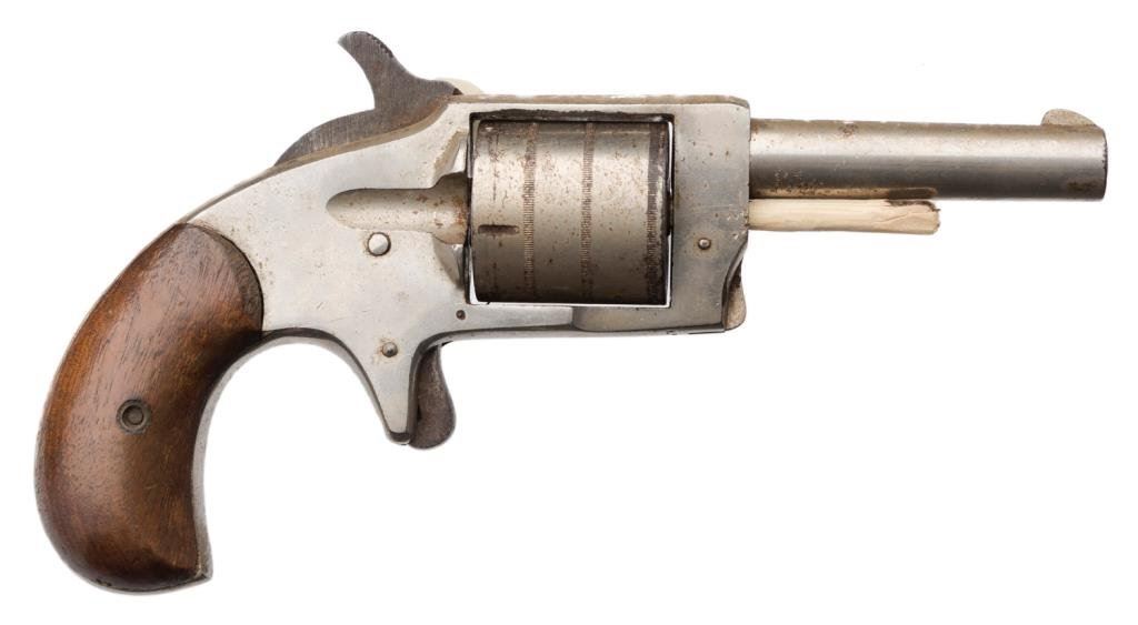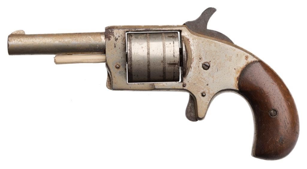 Hard Pan No. 2 spur trigger revolver, .32 cal., 2-3/4” barrel, nickel finish, wood grips, #9206. This gun is in overall fair to good condition showing uncleaned considerable nickel finish, dark bore, cylinder pin missing, good grips; a good project gun. Est.: $100-$300.