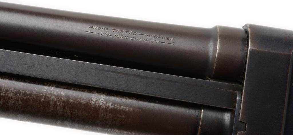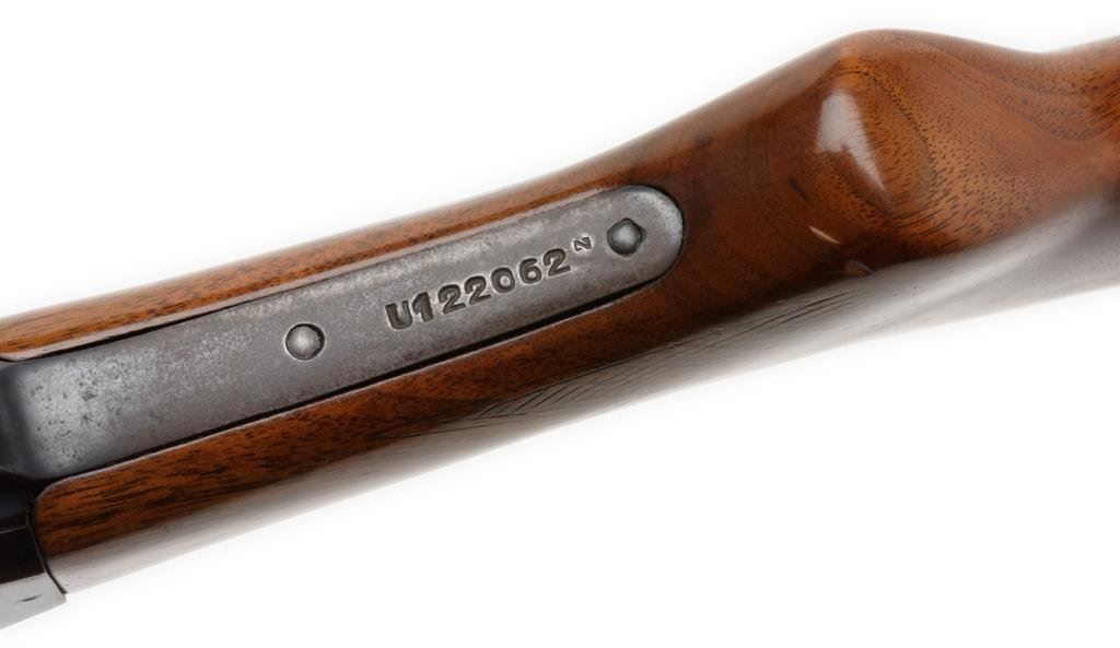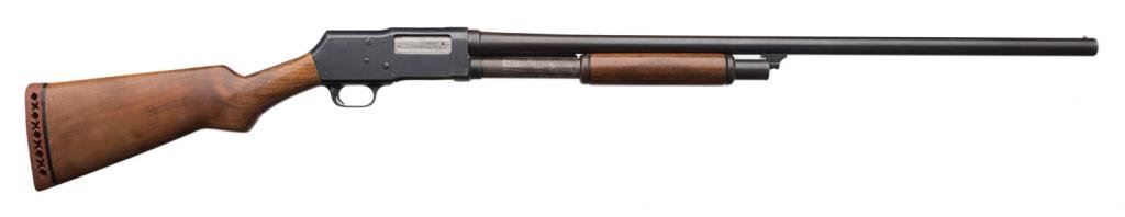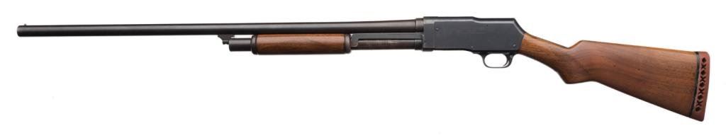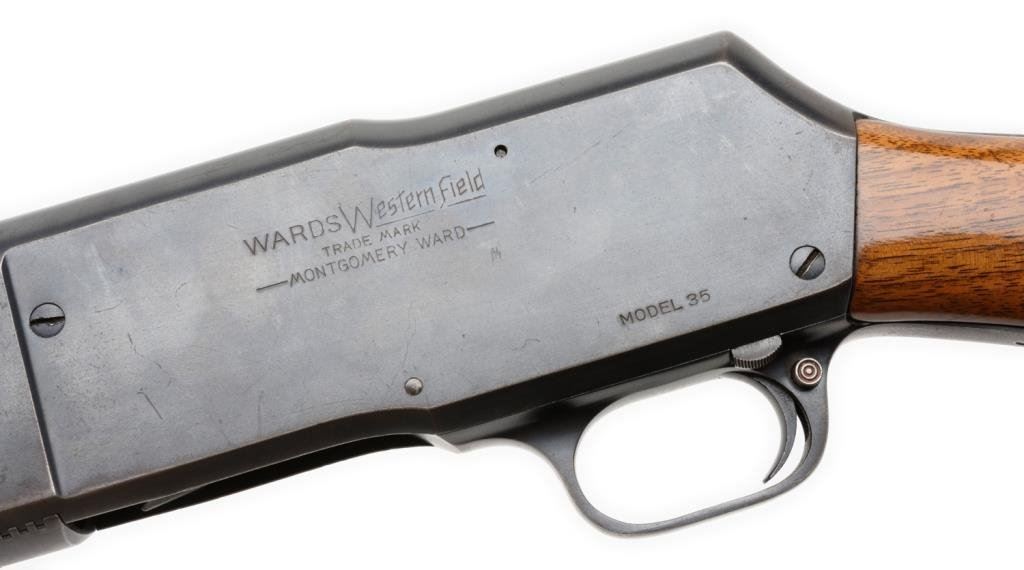 Wards Westernfield Model 35 pump action shotgun, 12 gauge, 30” barrel, blue finish, checkered wood stocks, #U122062 in overall very good condition showing considerable original finish, very good + bore, crisp action and good to very good wood with Westernfield red hard rubber butt pad. Est.: $125-$175.
