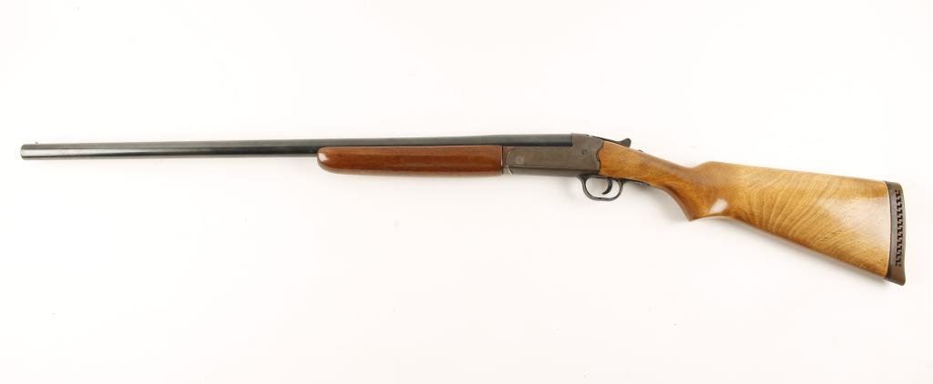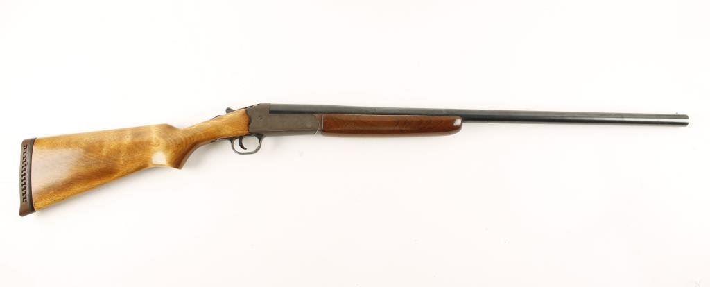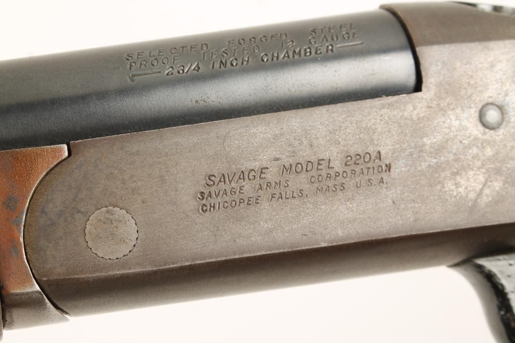 Savage Model 220A top break single shot shotgun, 12 gauge, 2-3/4” chamber, 28” barrel, blue and case hardened finish, light wood butt stock with hard rubber butt pad, #NVSN. This gun is in overall good condition with considerable blue finish on barrel with scattered spots of erosion and some pitting near the muzzle, muted case colors on the receiver, very good bore, good action, very good wood stocks. Est.: $75-$150.
