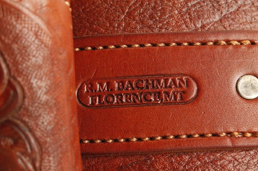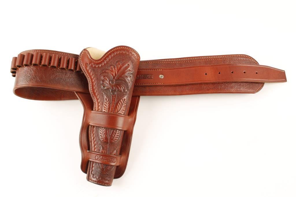 Modern tooled leather double loop holster for a Single Action Army revolver with cartridge belt marked “R.M. Bachman, Florence, MT, in fine condition. Est.: $175-$275.