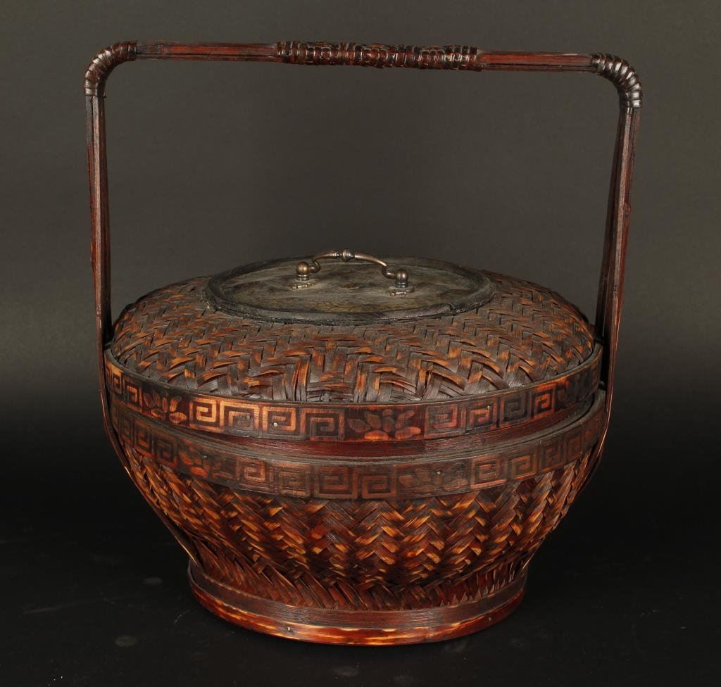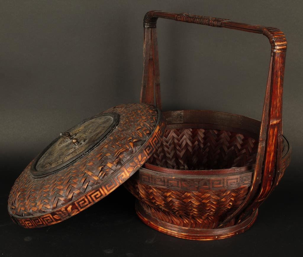 Woven Chinese sewing basket ca turn-of-the-Century; approximately 12.5” to top of handle. Est.: $100-$200.