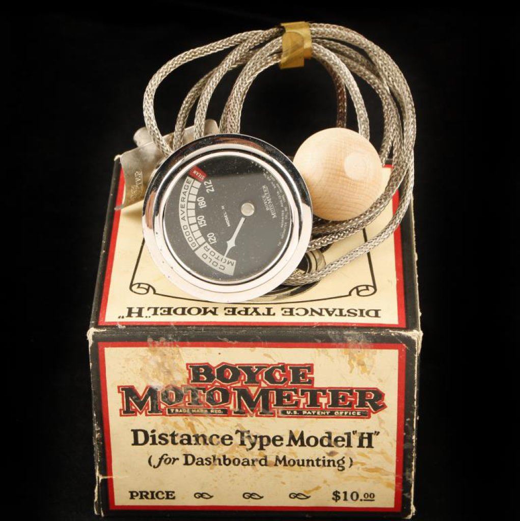 Boyce MotoMeter dash mount in box, patent 1916; manufactured ca 1920’s-30’s; near mint condition. Est.: $200-$400.