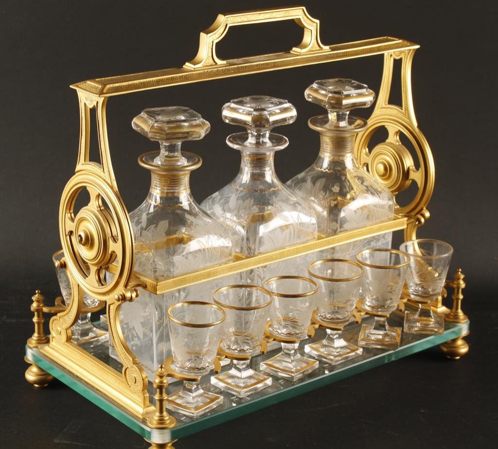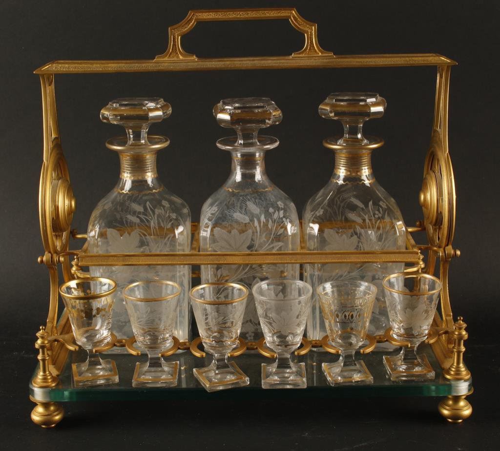 Decanter set of high quality; 19th to early 20th Century; locks to keep servants out; three etched glass and gold decorated decanters (matched), twelve shot glasses (matched) and gilt metal frame; exceptional; approximately 11.5” in height by 13” across. Est.: $350-$700.
