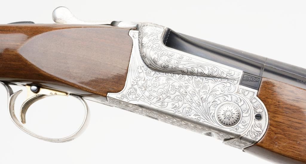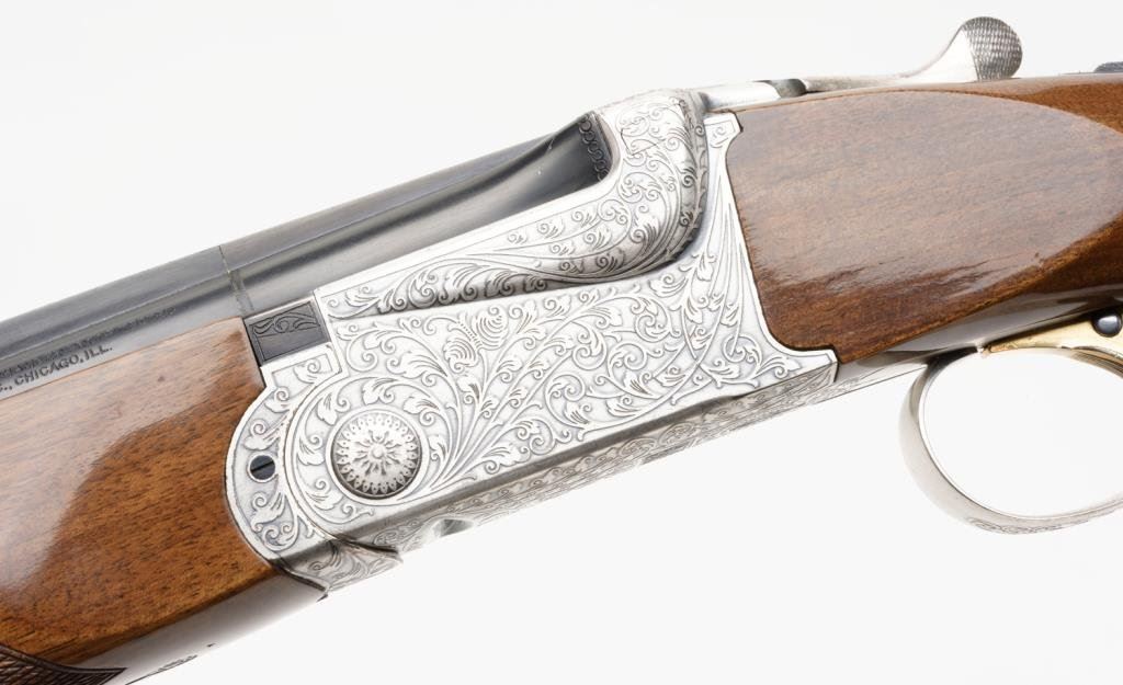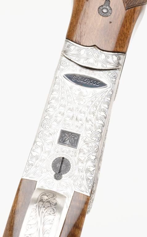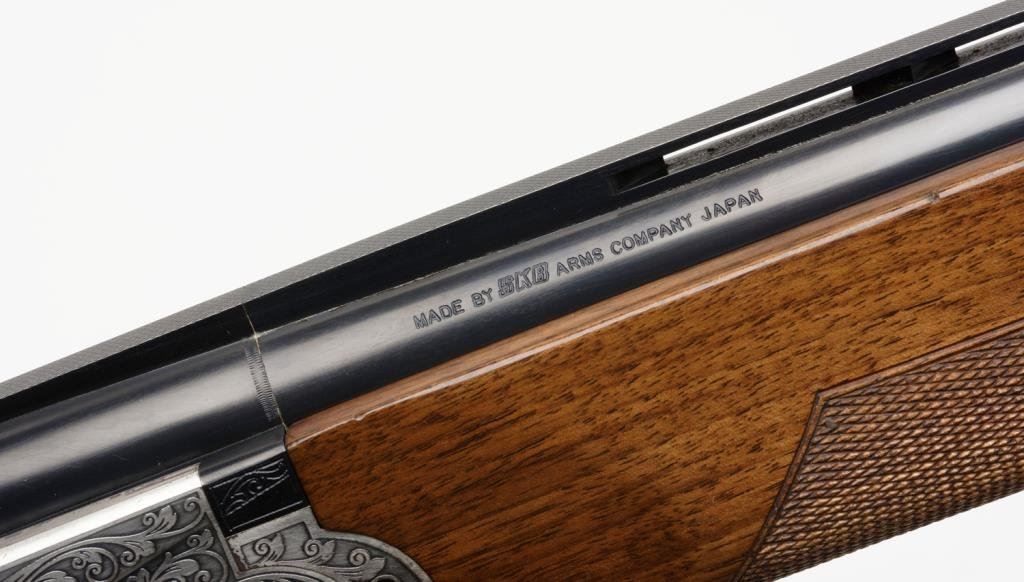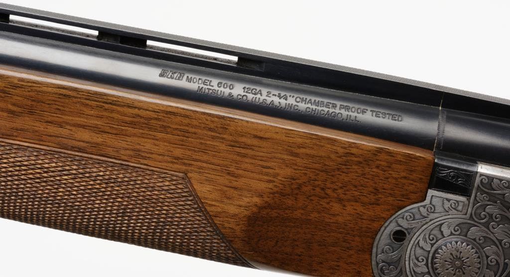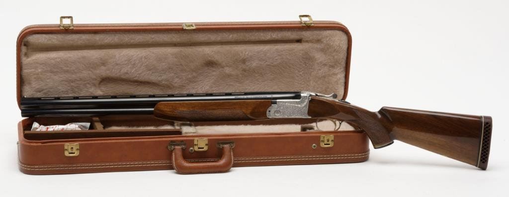 *SKB Model 600 over/under shotgun, 12 gauge, 26” ventilated rib barrels, S/N S 5659005, blued finish, engraved receiver, checkered wood stocks in overall very good to fine condition with Browning leather covered hard case. Est.: $600-$1,200.