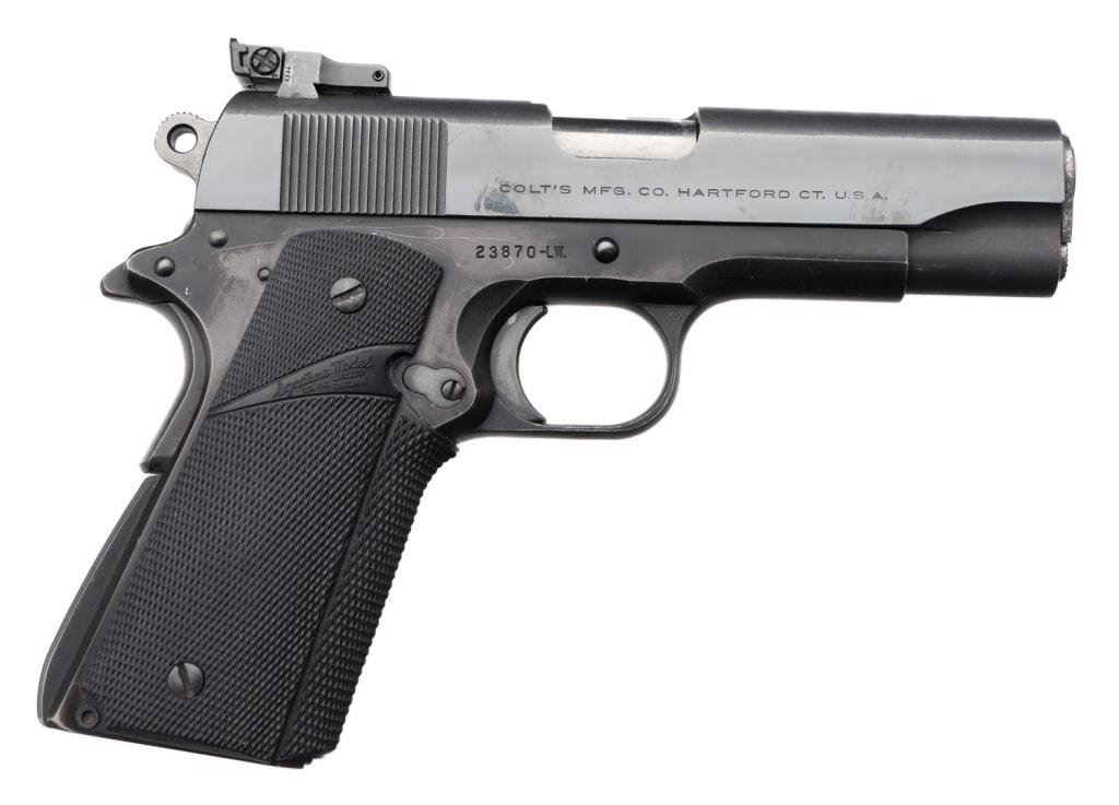 *Colt Lightweight Commander Model semi-automatic pistol, .45 caliber, 4.25” barrel, S/N 23870-LW, blued finish, checkered wrap around Pachmayr combat grips, no magazine, adjustable rear sight; missing front sight; overall very good to near fine condition with very good bore and crisp action. Est.: $900-$1,400.