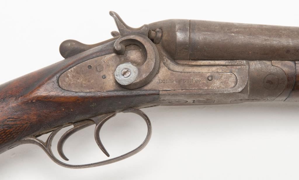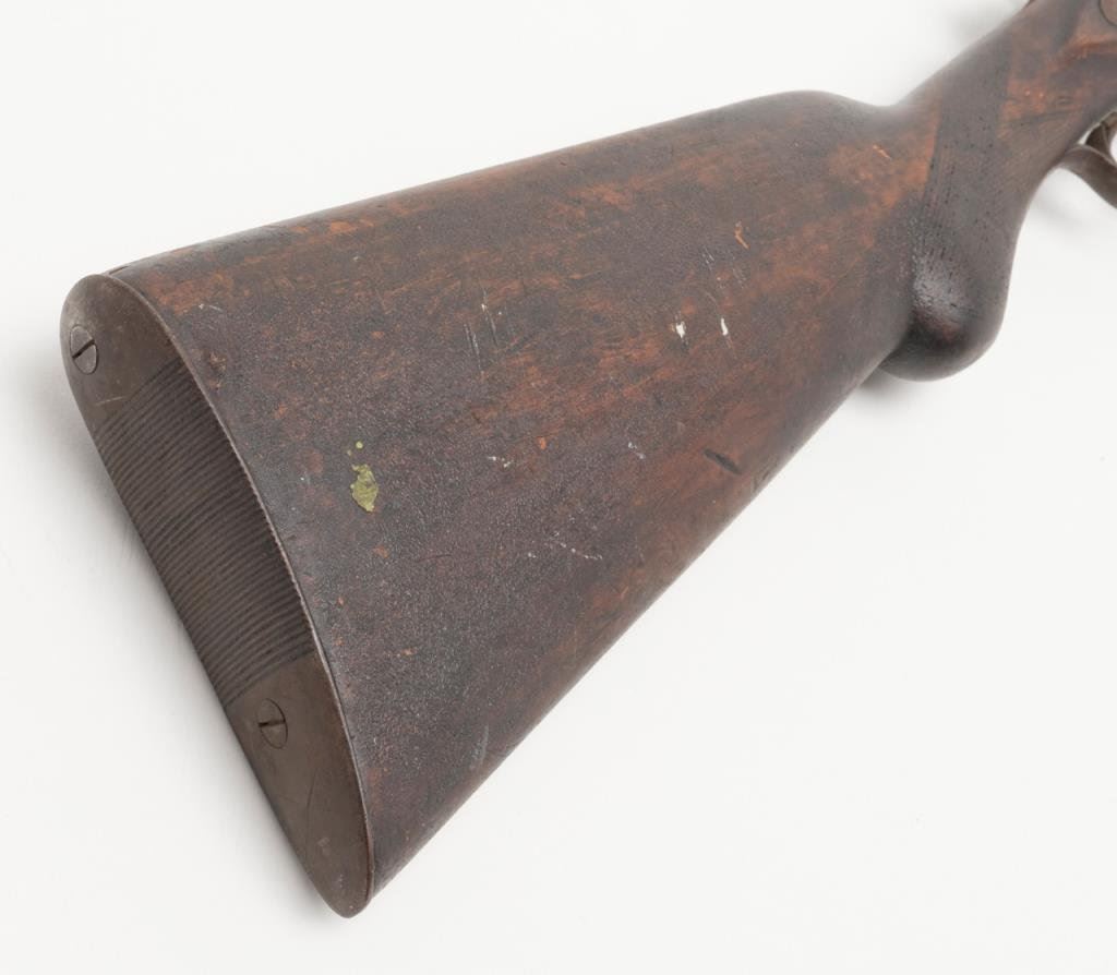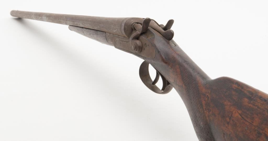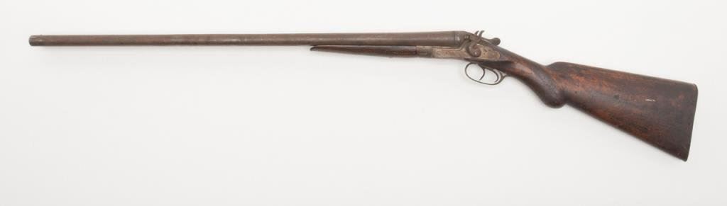 Belgian exposed hammers SxS shotgun, heavy dark patina, rough condition overall; a good wall hanger or display piece. (Antique) Est.: $100-$175.