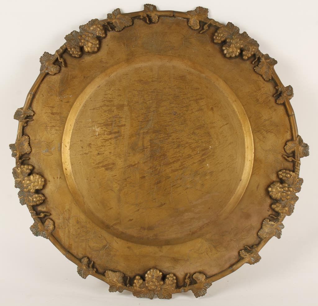 Chinese brass plaque with ornate fruit border and engraved center of wise men; approximately 18” across center; turn-of-Century or slightly earlier. Est.: $150-$300.