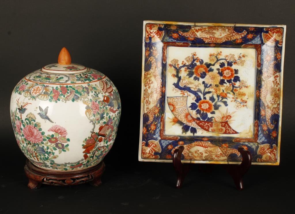 19th Century Chinese Ginger Jar in porcelain; signed; good raised paint work; along with a Japanese square bowl with receipt dated 1934 from K. Tashiro (porcelain & Satsuma) Yokohama, Japan for $15 identifying and stating this bowl being 200 years old in 1934; sold to Mrs. S. C. Kingsbury aboard the S.S. Peter Maersk, Cabin 5. Note: also I.D. as Imari; approximately 11.25” by 11.25”. Est.: $300-$600.