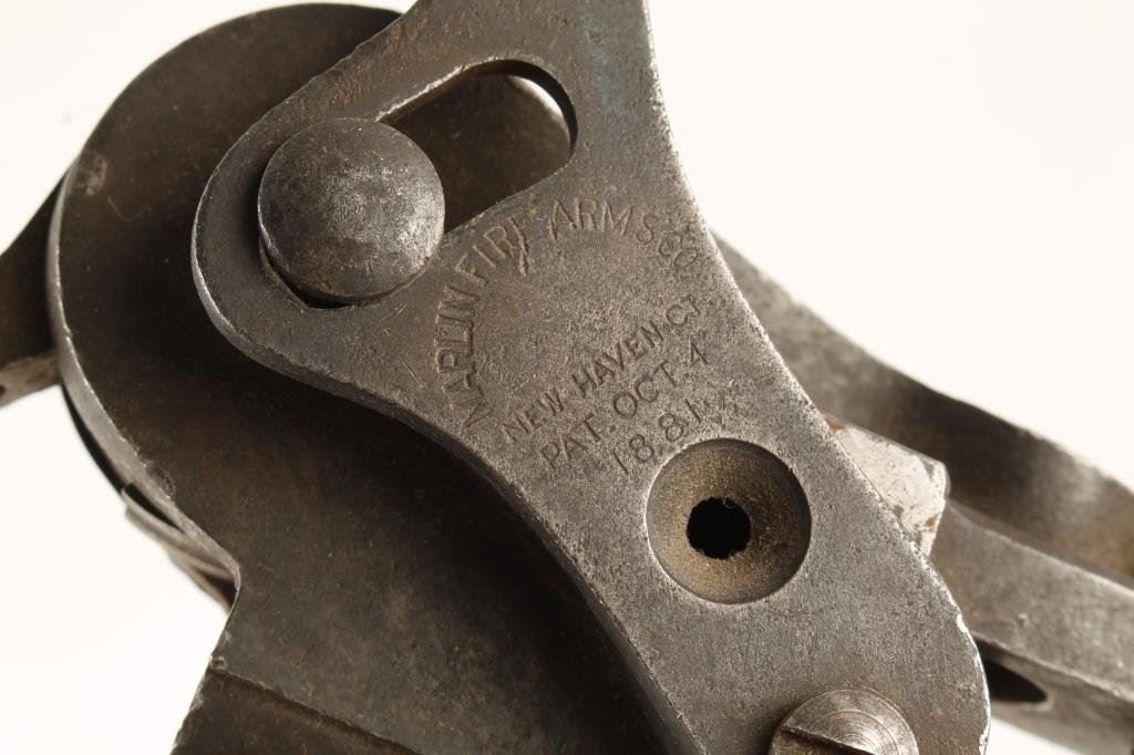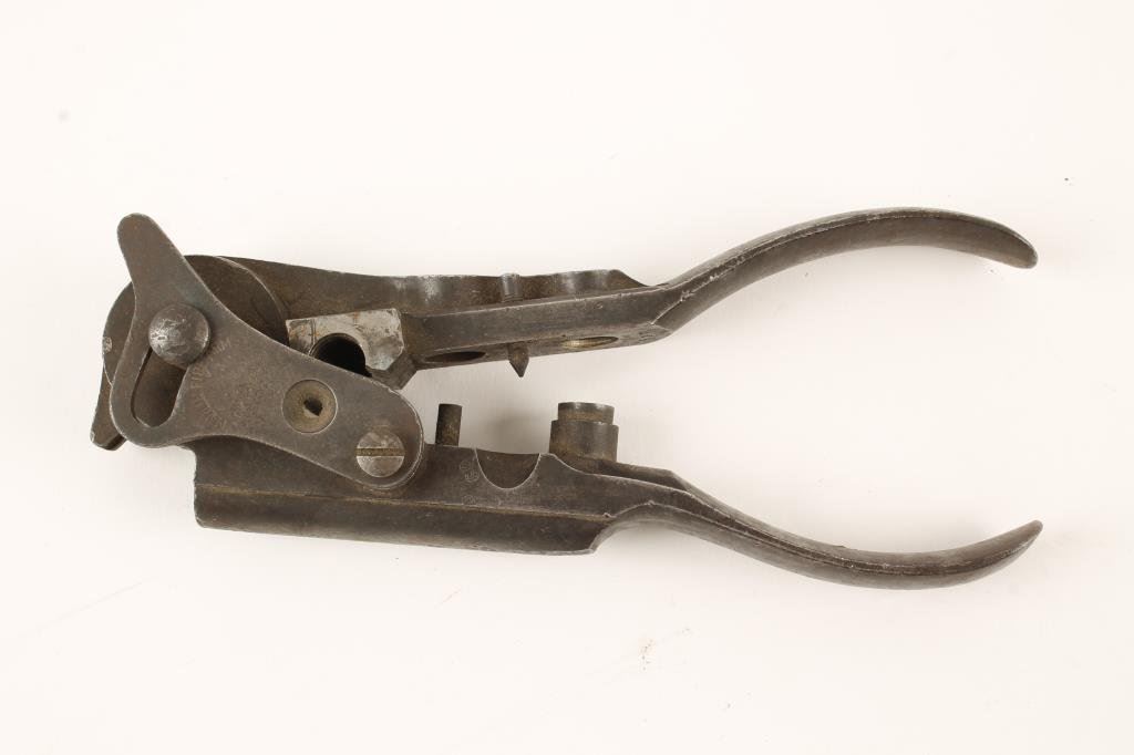 Marlin combination mold and reloading tool, last patent date 1881 marked .45-60 caliber W&K for Winchester and Kennedy rifles. The tool is in fair to good condition showing a brown patina finish and some light to moderate pitting. Markings good. Est.: $250-$500