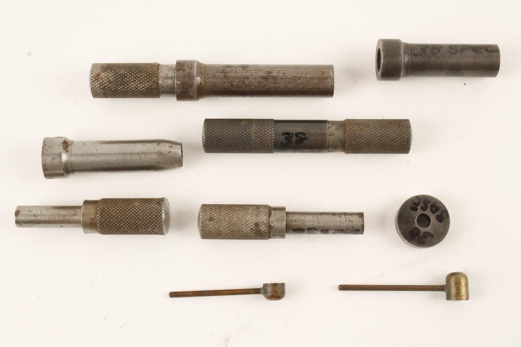 Smith & Wesson style reloading set for .38 caliber Smith & Wesson, 5 pieces and 2 brass powder dipper’s. Good to very good condition. Est.: $150-$300