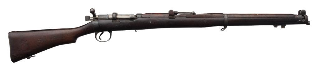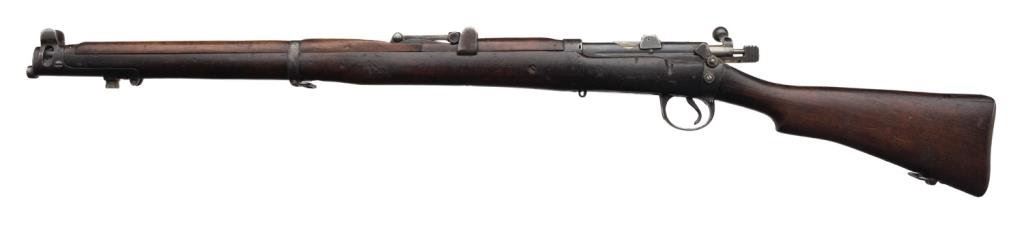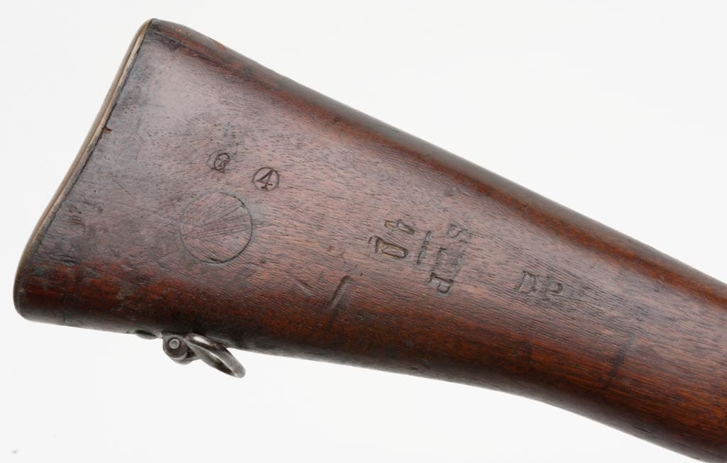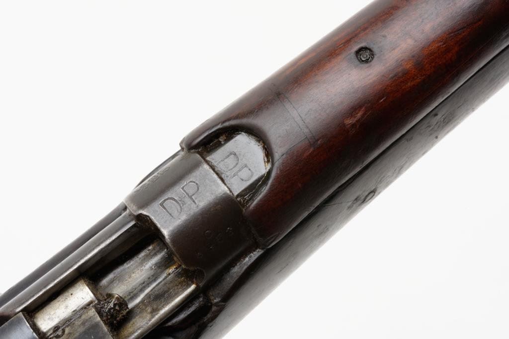 B.S.A. bolt action military “Drill Rifle”, .303 cal., (in-operable as features a firing pin with no tip and face welded closed; 25” barrel, military finish, full length wood stock, #O 8866 in fair condition showing the magazine “port” closed off with a piece of wood (some time ago) and a stationary action interior; wood is worn with “DP” stamp and other markings; some scattered old repairs. (C&R). Est.: $100-$200.