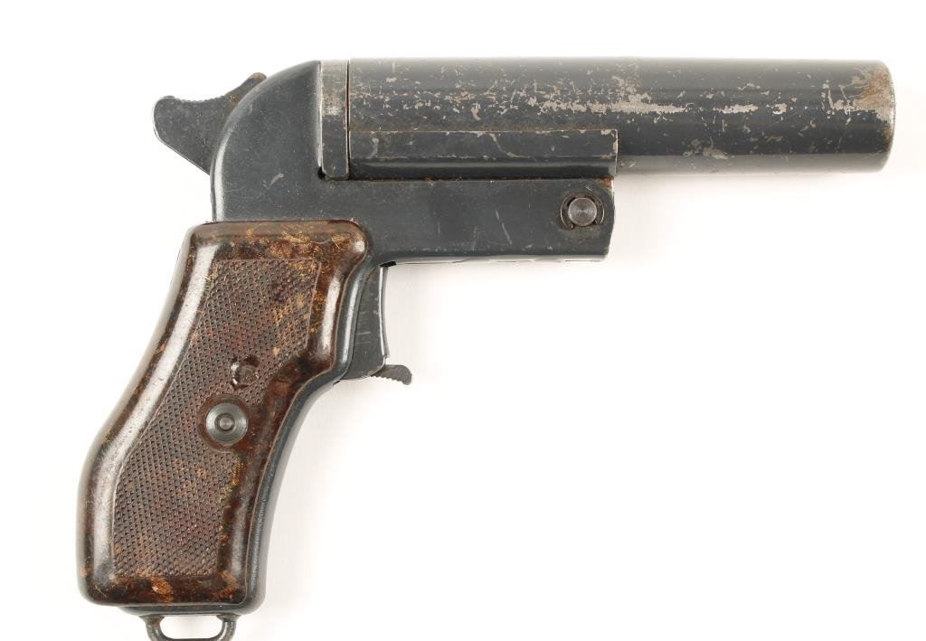 Czech flare pistol, grey finish, checkered brown grips, #25963 in overall good condition. Est.: $100-$200.