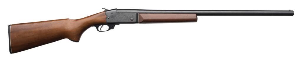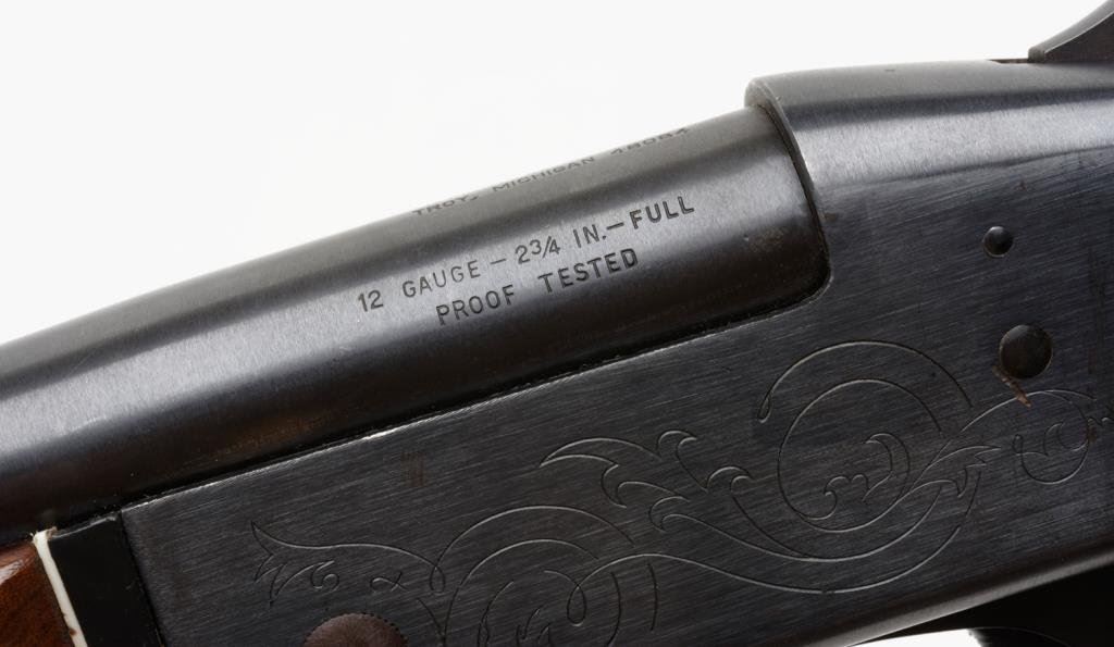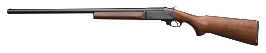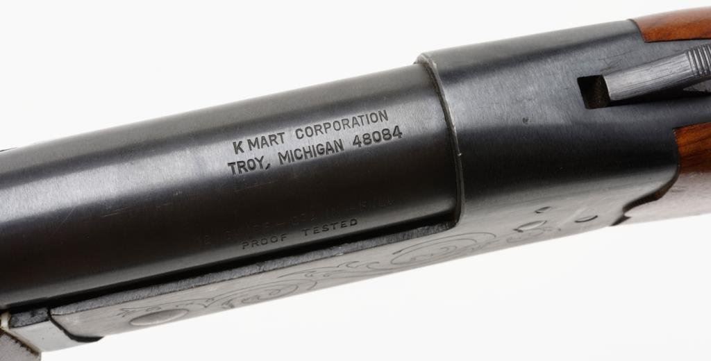 K-Mart Model 151 single shot shotgun, cal. 12 Gauge, Serial #807865. The shotgun is in overall very good condition with a 28” blued barrel and brass bead front sight. The shotgun retains nearly all of its blued finish, while action is engraved with a simple scroll pattern. The smooth wood stocks are in overall good condition with mars and paint transfer and hard rubber butt plate. The bore is very good, action crisp and markings sharp. (Modern/PPT). Est.:$100-$200.
