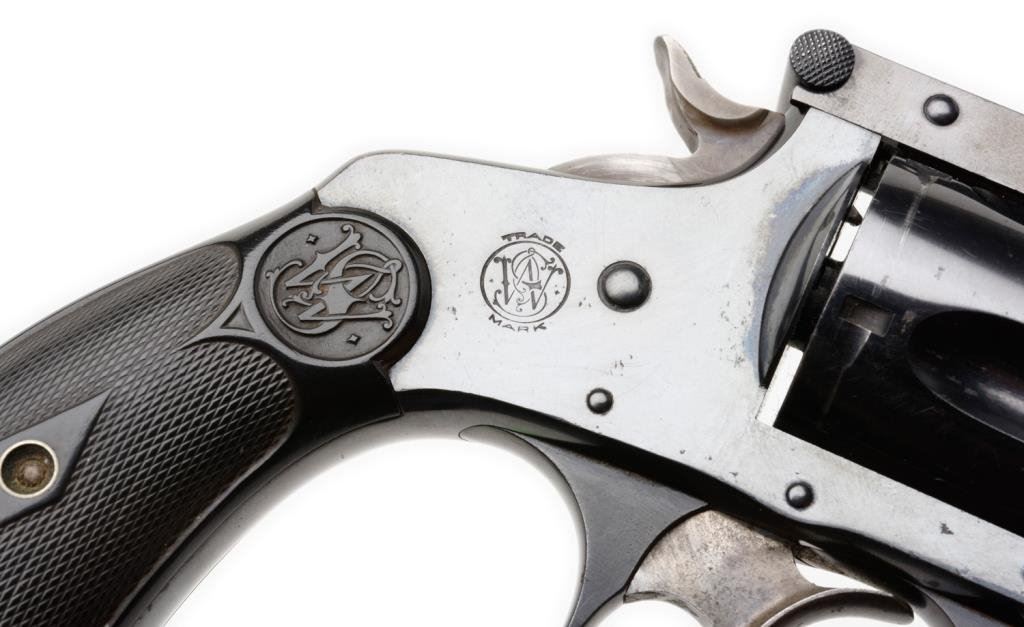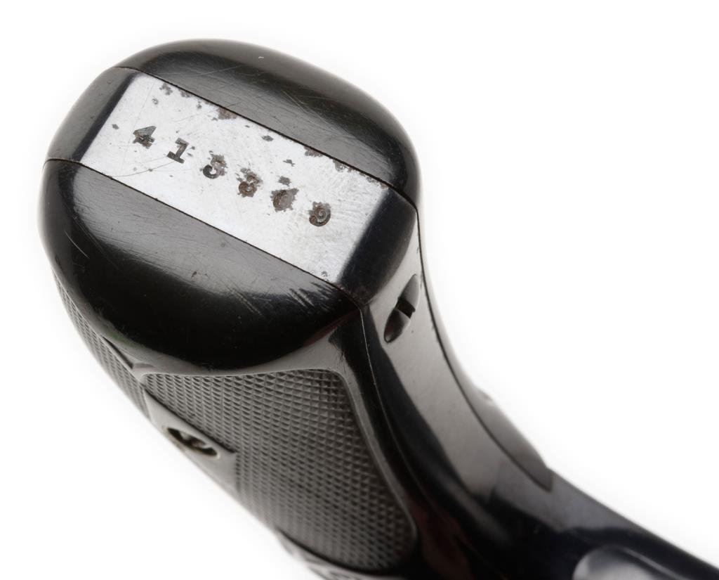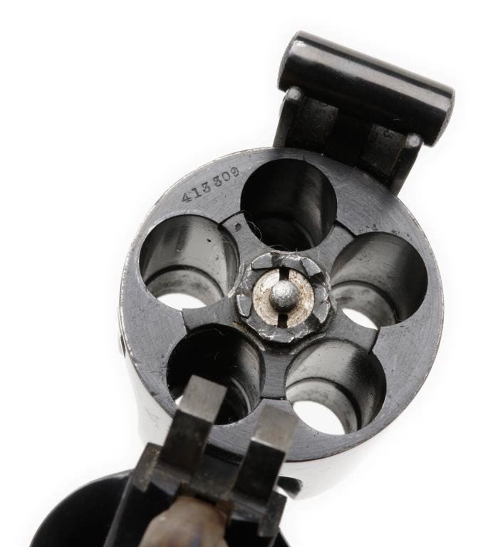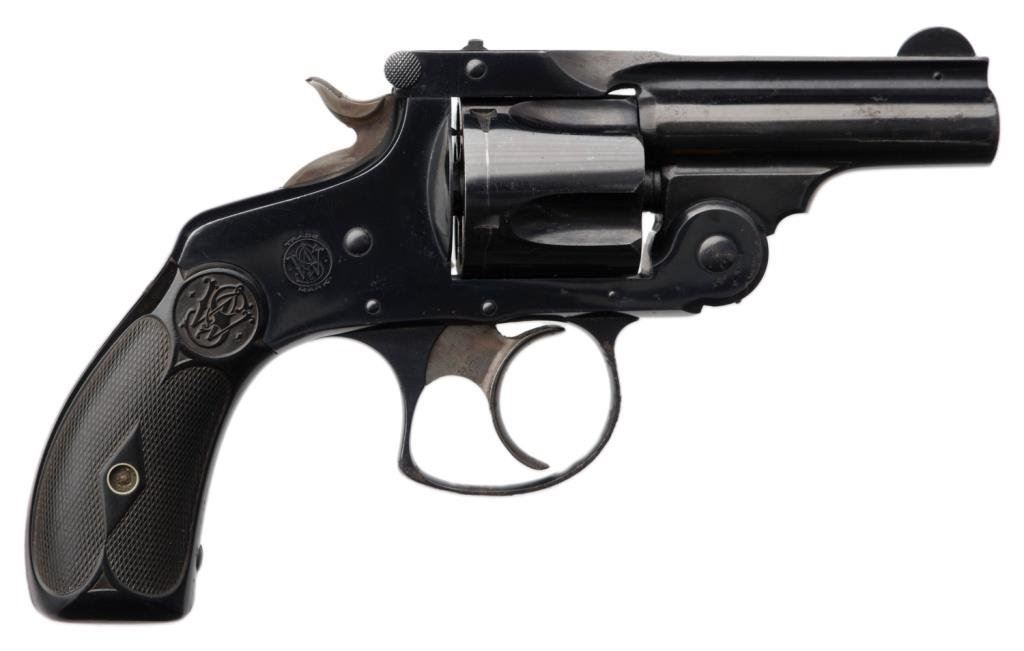 **Smith & Wesson 4th Model DA pocket top break revolver, .38 caliber, 2.75” barrel, S/N 413309, blued finish, checkered hard rubber grips; overall fine condition although this gun does not have a barrel address and there is under the left grip “6.50” stamped (return to factory for repair or re-finish date); still a fine piece, possibly sent back for customized shorter barrel. Est.: $400-$800.