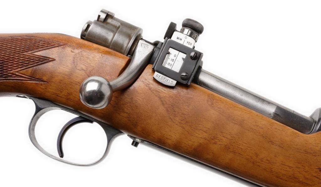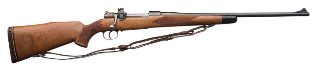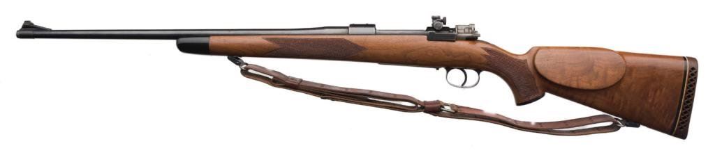**Sporterized Mauser bolt action rifle, 7.92mm caliber, 22.5” round barrel, no visible S/N, re-blued finish, custom checkered wood stock in overall good condition with leather sling. Est.: $300-$600.