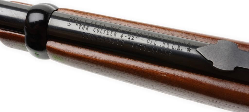 *Colt Colteer semi-automatic rifle, .22LR caliber, no visible S/N; overall very good condition with majority of original finish, good action and wood stocks. Est.: $250-$500.