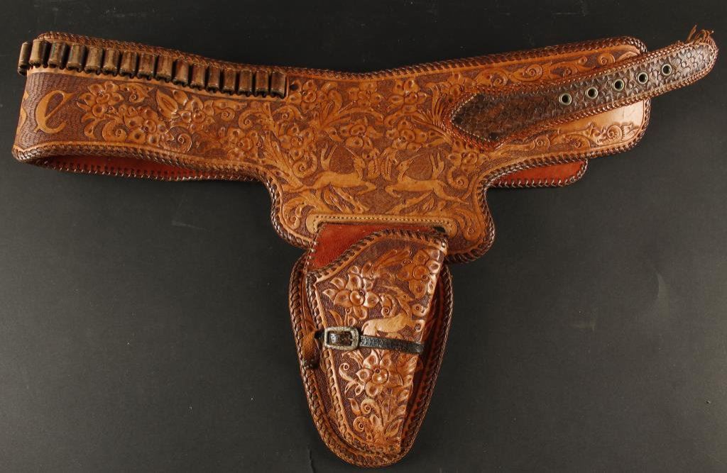 High grade and custom tooled leather set by Wal-Mar 1950’s-60’s for legendary T.V. Star Cid Caesar (Show of Shows). The belt has two holsters that interchange. One is for a Colt 5 ½” S.A. and the second is for a S&W Model 27 with a 2 ½” barrel. The condition is good with some fraying to the edges and the strap on the S.A. holster is broken. The floral and animal carvings are 1st rate with S.C. initials on the belt. Little Johns obtained these direct from descendants in Beverly Hills when transferring firearms for Julian's Auctions who sold the gun collection. We will include our letter of authenticity. Est.: $300-$600