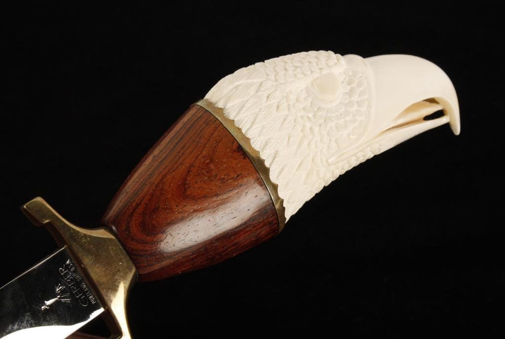 Rare Gerber factory eagle carved marine ivory (legal) gripped knife with registration numbers; approximately 6.25” spear point blade. Est.: $400-$800.