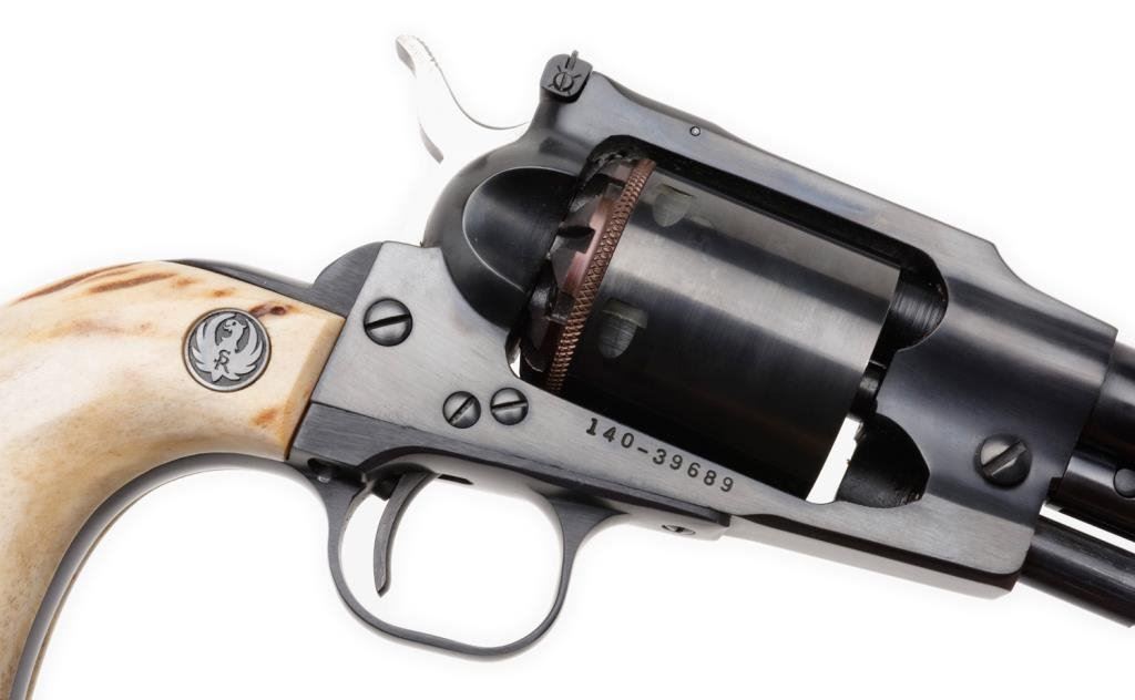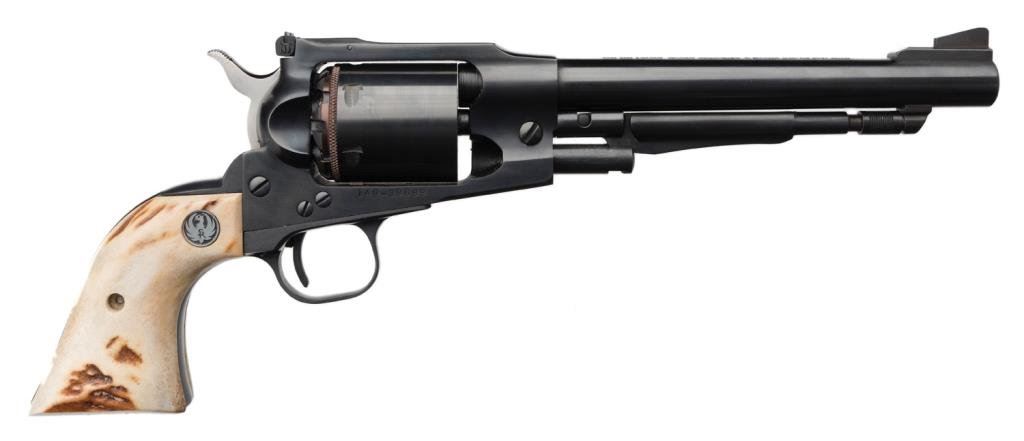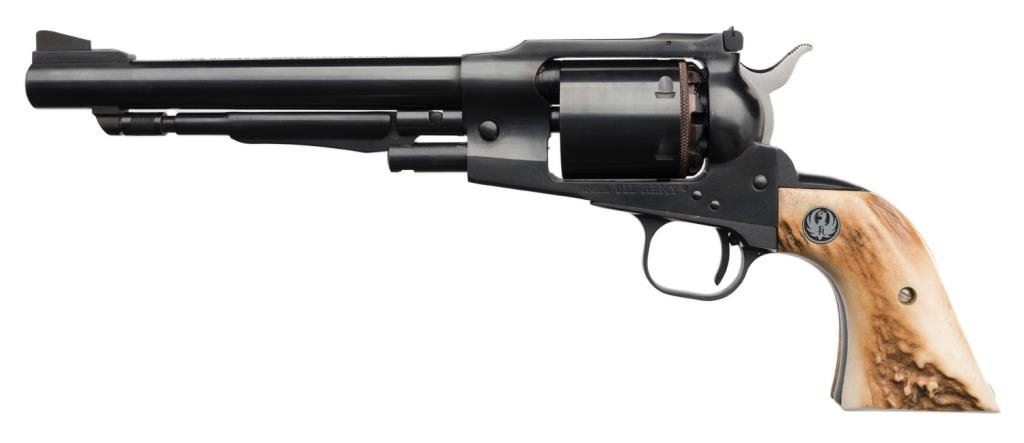 **Ruger Old Army Model single action conversion .44 caliber, 7.5” barrel, S/N 140-39689, blued finish, stag medallion grips in overall very good to fine condition. Est.: $300-$400.