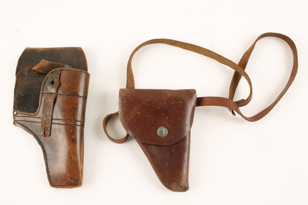 Lot of 2 early auto pistol holsters: 1. Schoverling, Daly, and Gale marked for Warner infallible. Good and rare 2. German style holster for a small auto .25 to .32 possibly Walther series. Est.: $100-$300