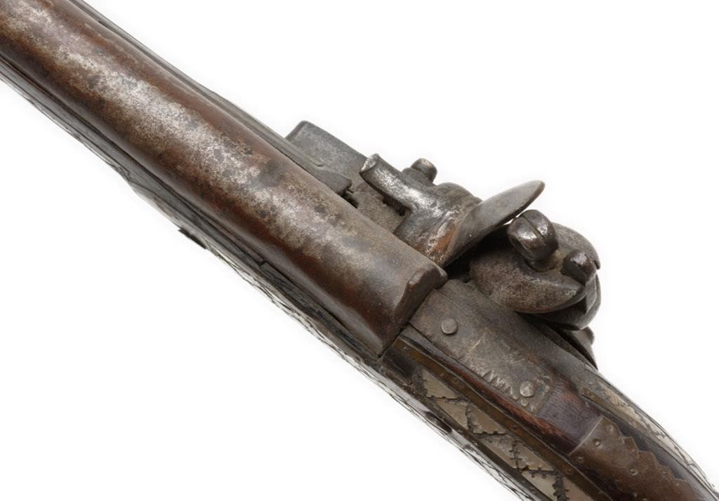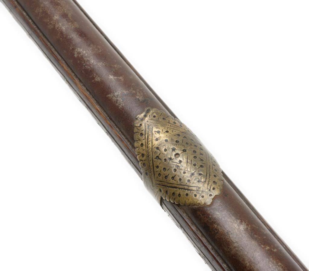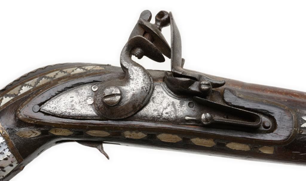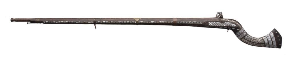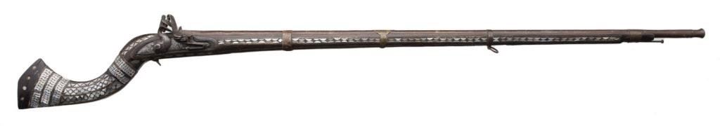 Mid-eastern Jeizil flintlock musket, 64” overall with a 49” barrel, pearl and brass inlays in full length stock, standing Lion on lock plate that appears to be dated 1810. Est.: $250-$500.