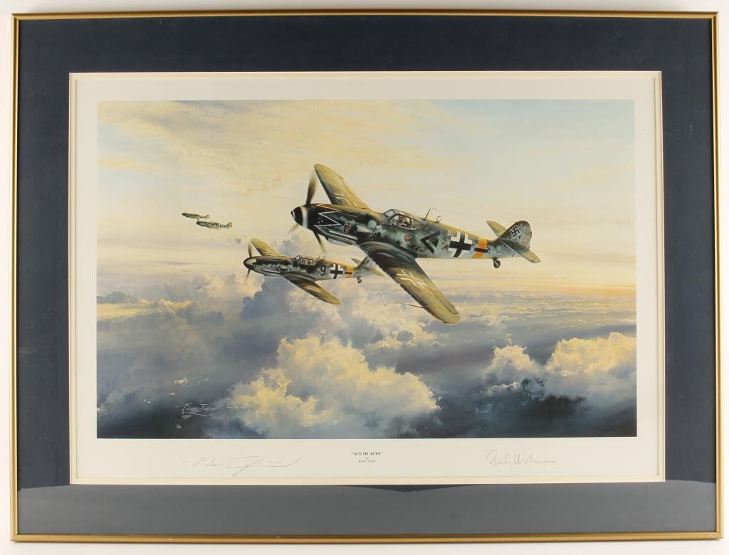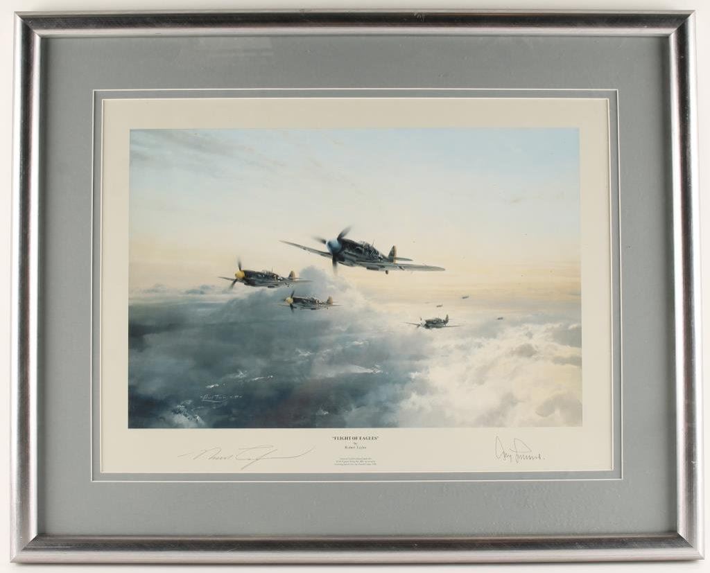 Finely framed and matted color litho entitled “Flight of Eagles” by noted artist Robert Taylor showing German General Adolf Galland leading a group of Me 109’s in flight; hand signed by the artist and General Galland; approximately 23” x 28” overall. Est.: $150-$300.