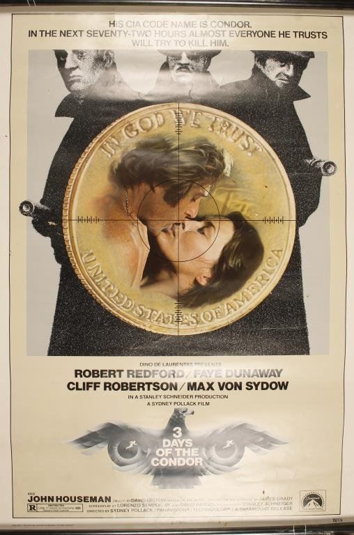 Modern classic, one sheet movie poster for the film, “3 Days of the Condor” starring Robert Redford. Est.: $100-$300.