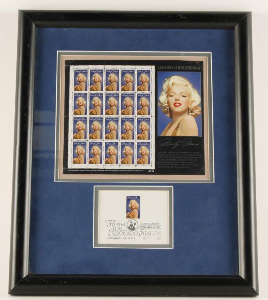 Framed collection of Marilyn Monroe commemorative stamps with a post card from the Hotel Del Coronado Station. The collection commemorates the location of the filming of the famous, “Some Like it Hot”. The postcard is dated, June 1, 1995. Est.: $100-$200.