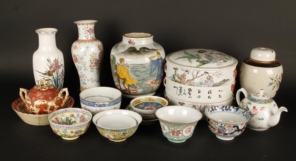 Oriental lot including: 1. Porcelain stacking bowls (3); turn of Century or earlier; good quality; 2. Interesting vase with scenes of deities, appears 19th Century or earlier; possibly Japanese, approximately 6.75” in height; 3. Chinese egg shell thin porcelain bowl with dragons on yellow ground; red chop signed; great quality; 4. Chinese small bowl with flowers, pre-1900 plus 14 decorative shelf pieces, a couple with some merit and age. Est.: $300-$600.
