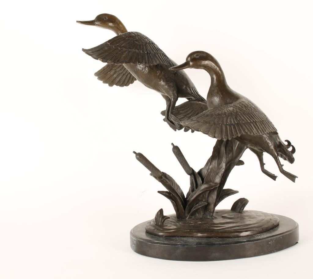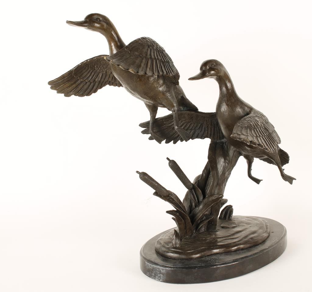 Bronze of two Mallard ducks, approximately 17” in height on stone base. Est.: $100-$200.