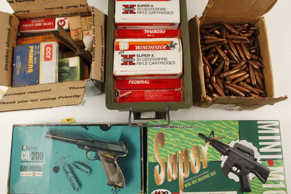 Misc. lot of bullets including .50 caliber; .270 brass and bullets; a K-Mart Focal telescope; a Daisy CO2 Model 200 air pistol and UHC Super mini M16 airsoft. Est.: $150-$300.